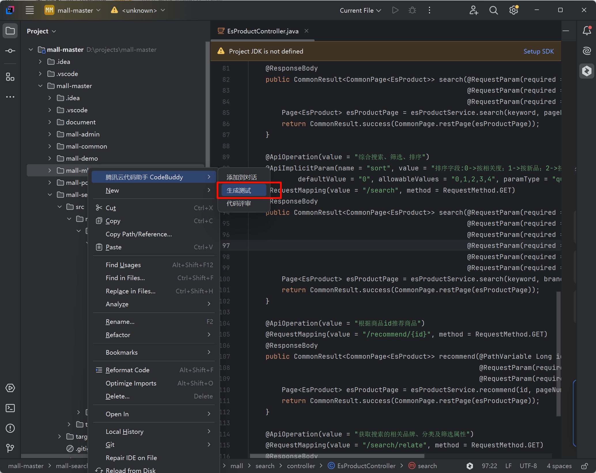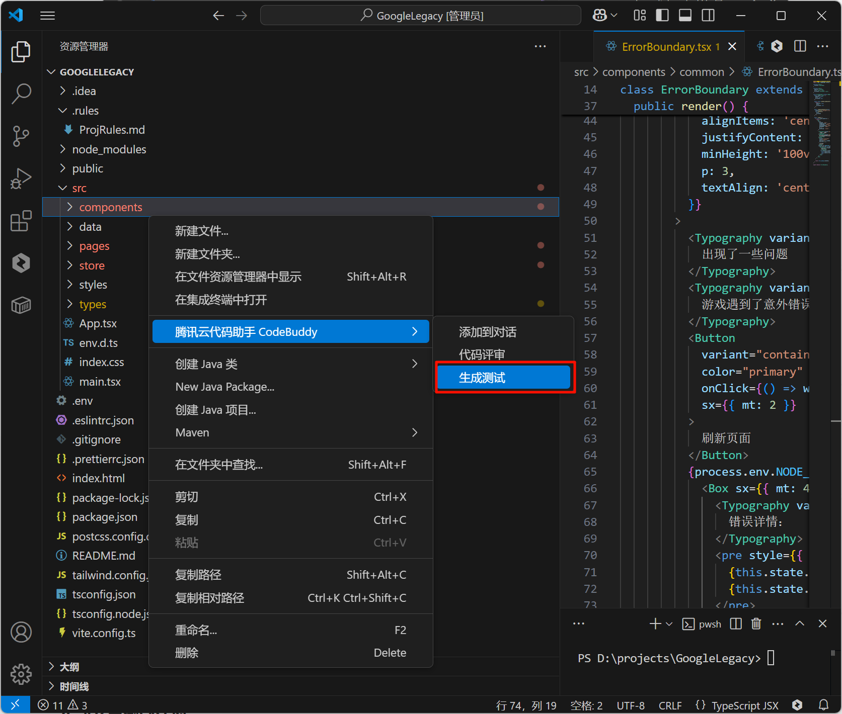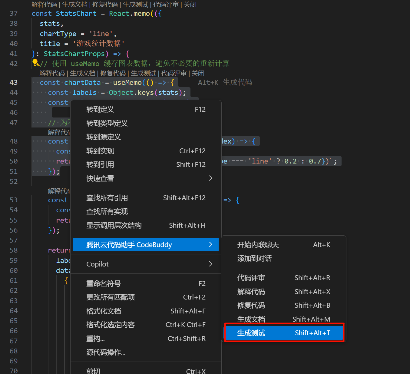 圈选代码后,右键选择腾讯云代码助手 CodeBuddy > 生成测试。