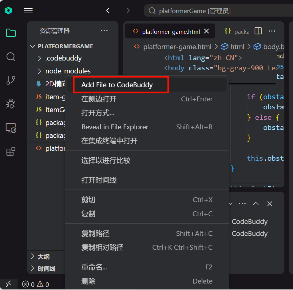 在文件树中,右键单击文件/目录,在菜单中选择 Add File to CodeBuddy,将文件/目录添加到对话中,触发单元测试生成。