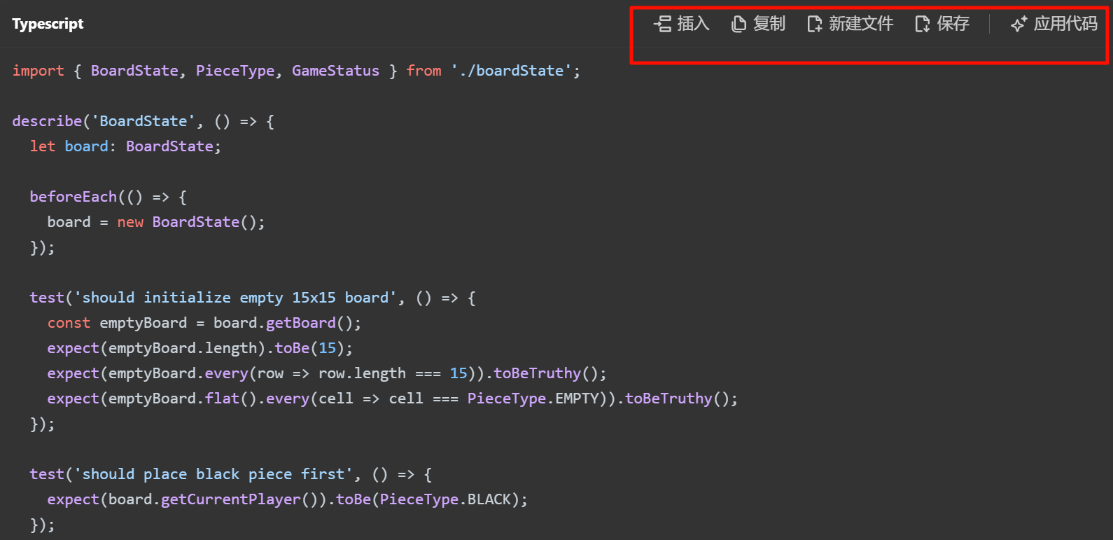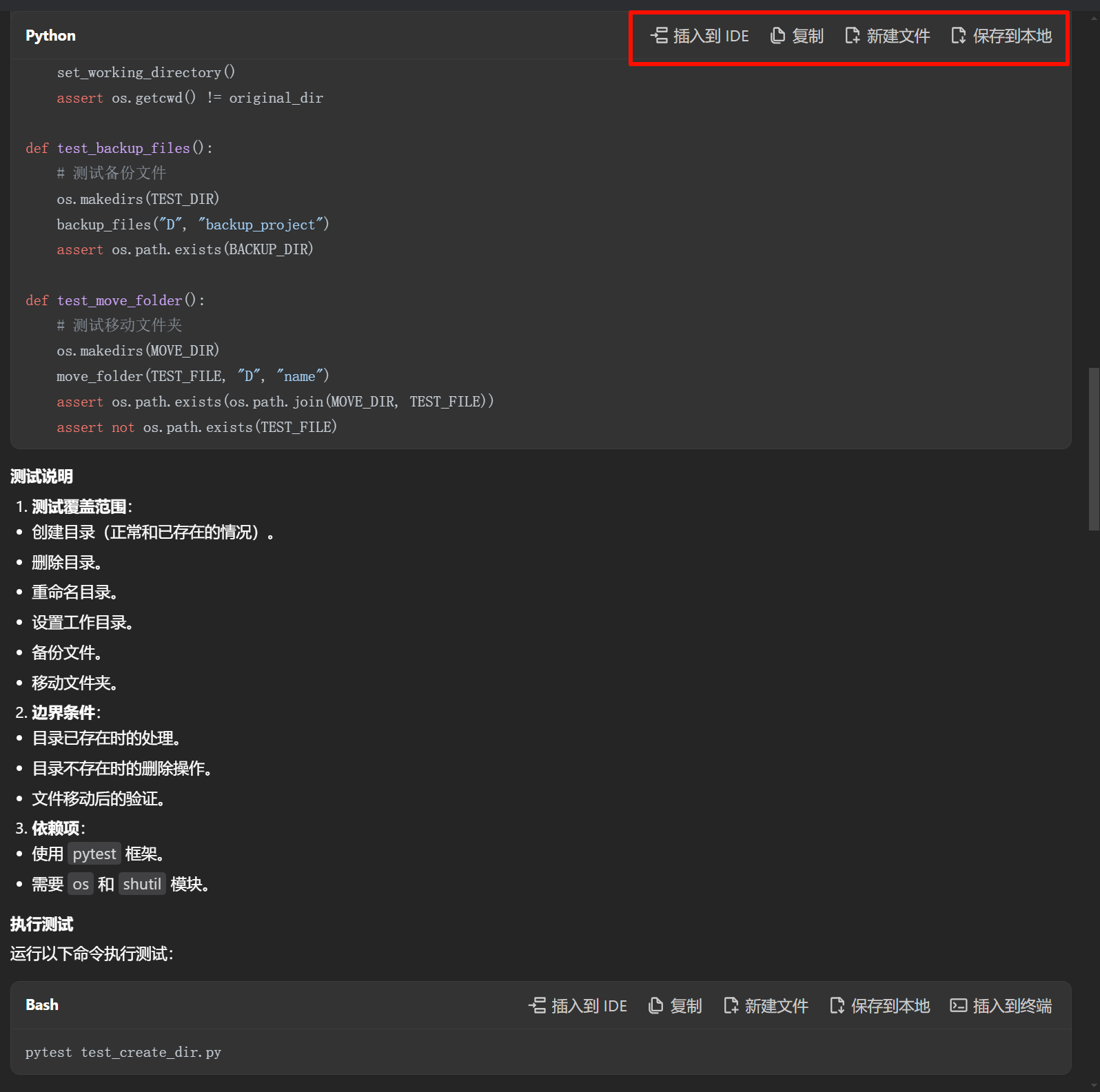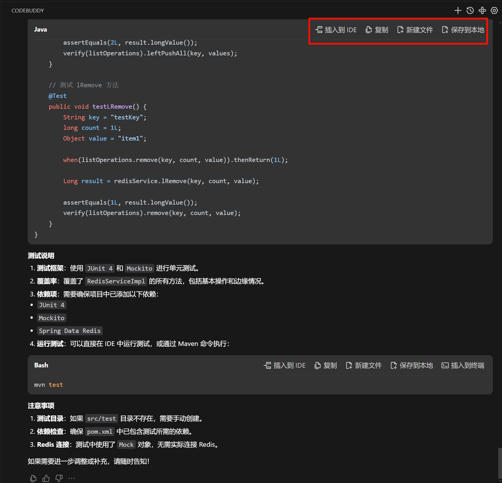 生成单元测试代码后,您可以根据实际情况来选择不同的应用代码方式,支持插入到 IDE、复制、新建文件以及保存到本地的方式。应用代码后,可以根据测试说明来运行测试进行验证。