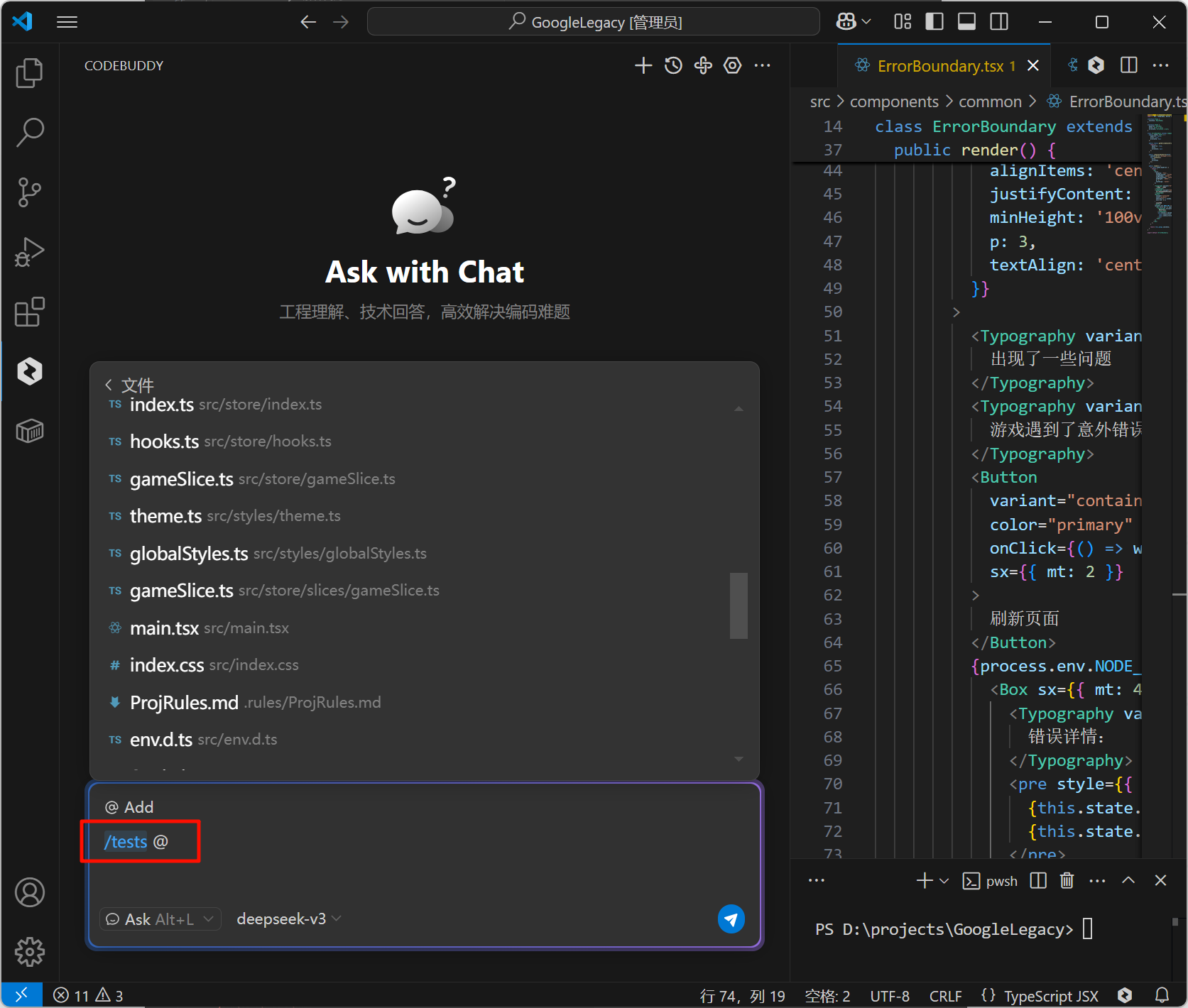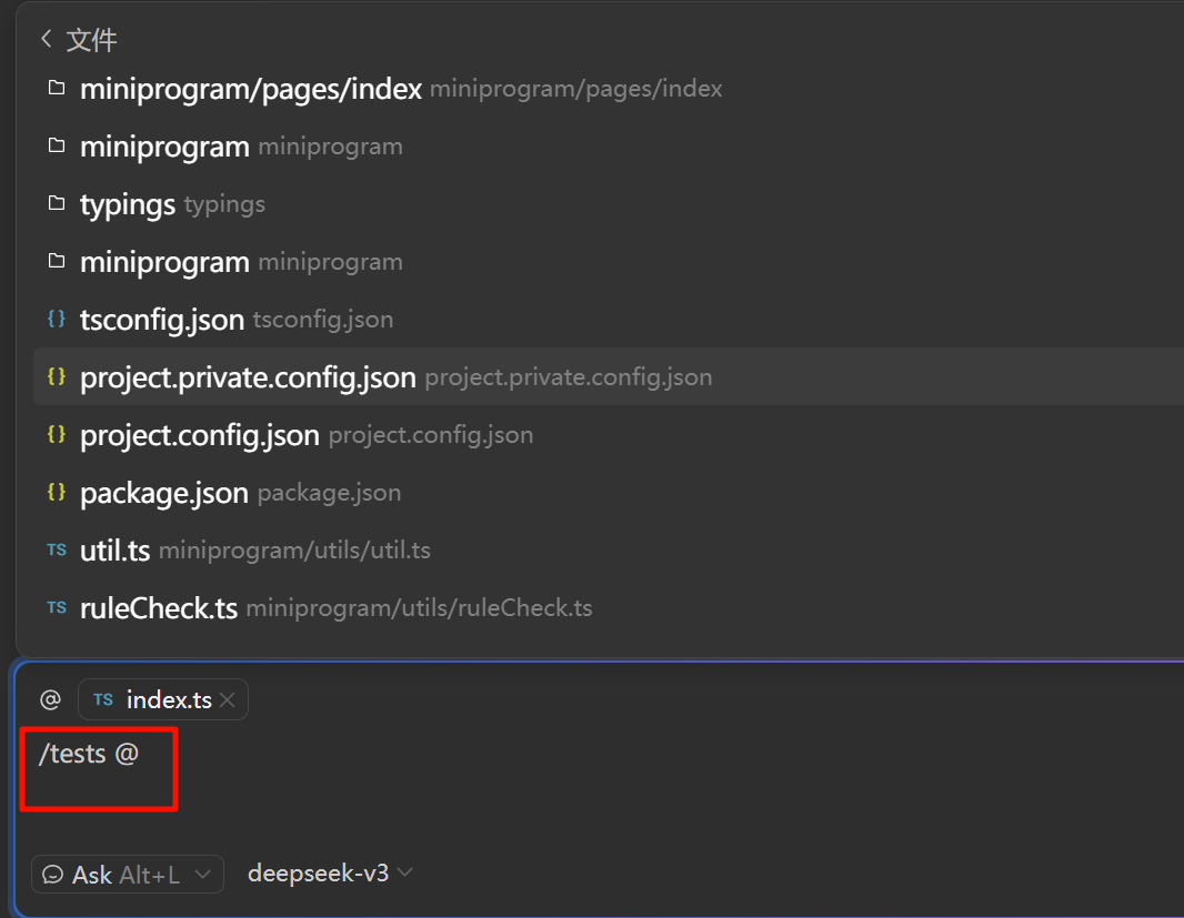 /tests 指令,然后通过 @ Add 添加单个或多个文件或目录,最多可以选择15个文件。