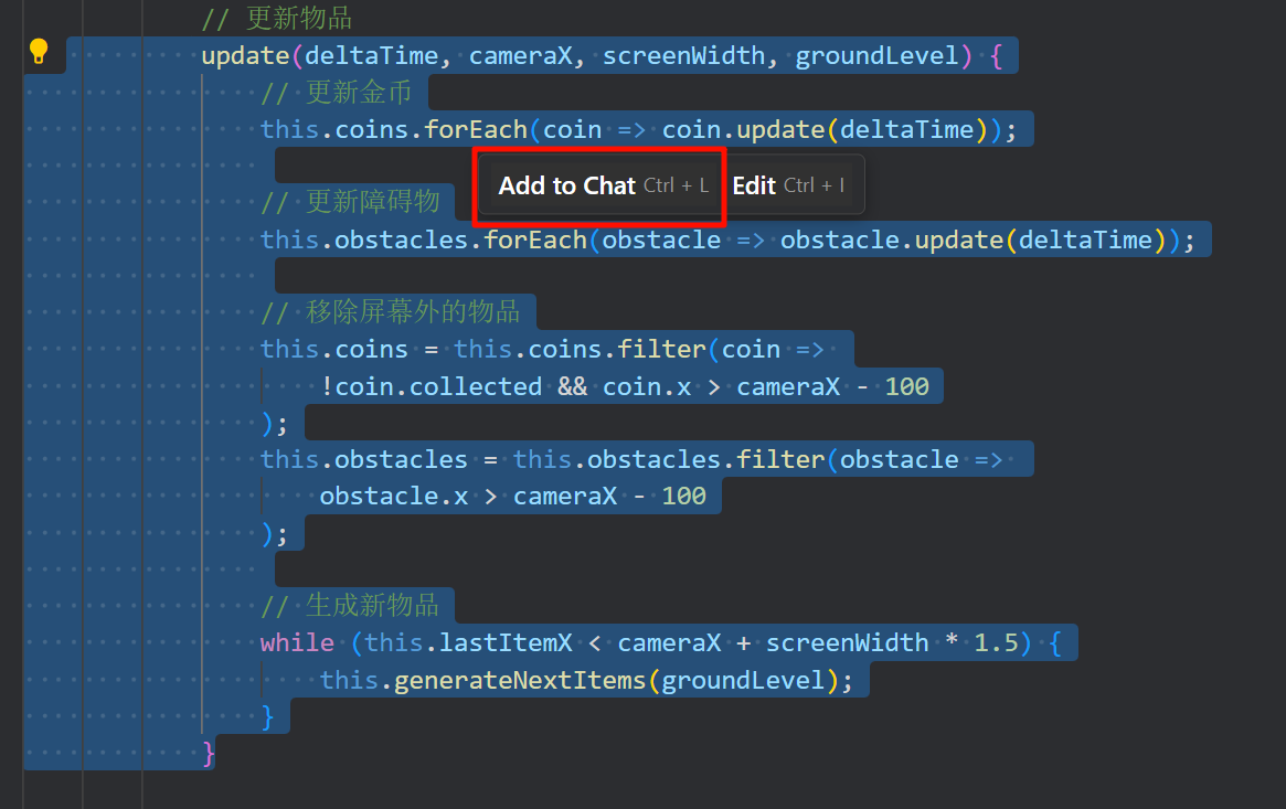 圈选方法或函数的代码块后,在弹出菜单中单击选择 Add to Chat 按钮,或者直接使用菜单右侧提示的快捷键,将代码添加到对话中触发单元测试生成。