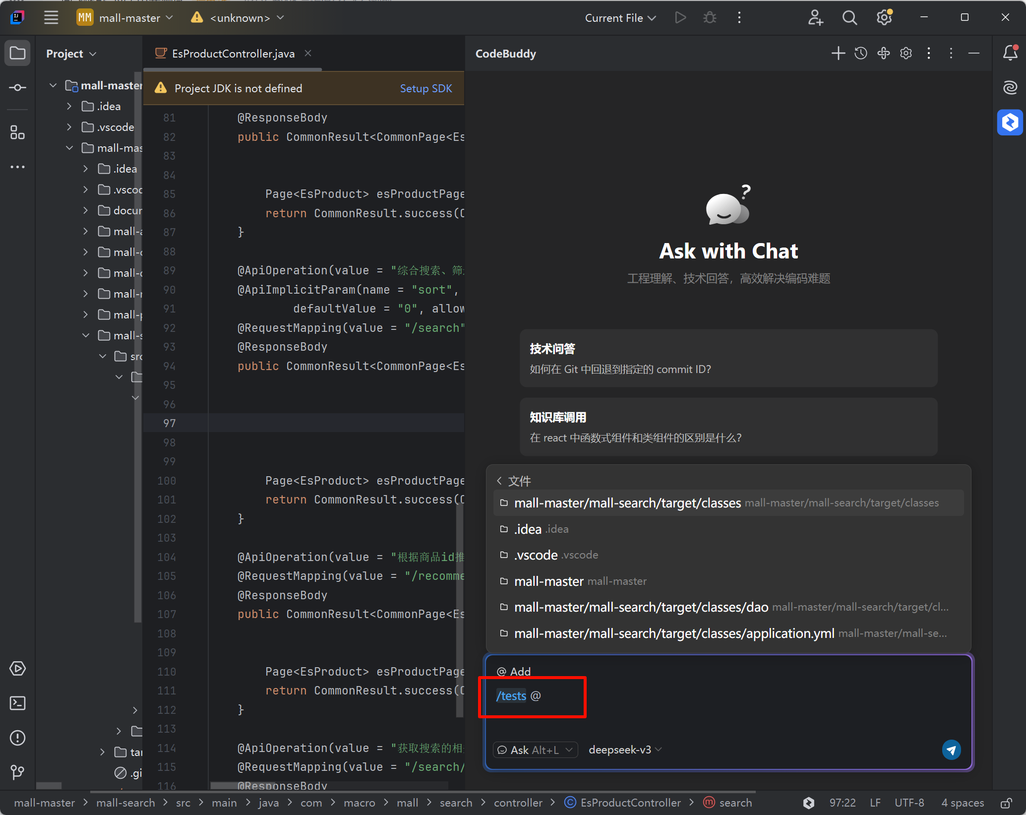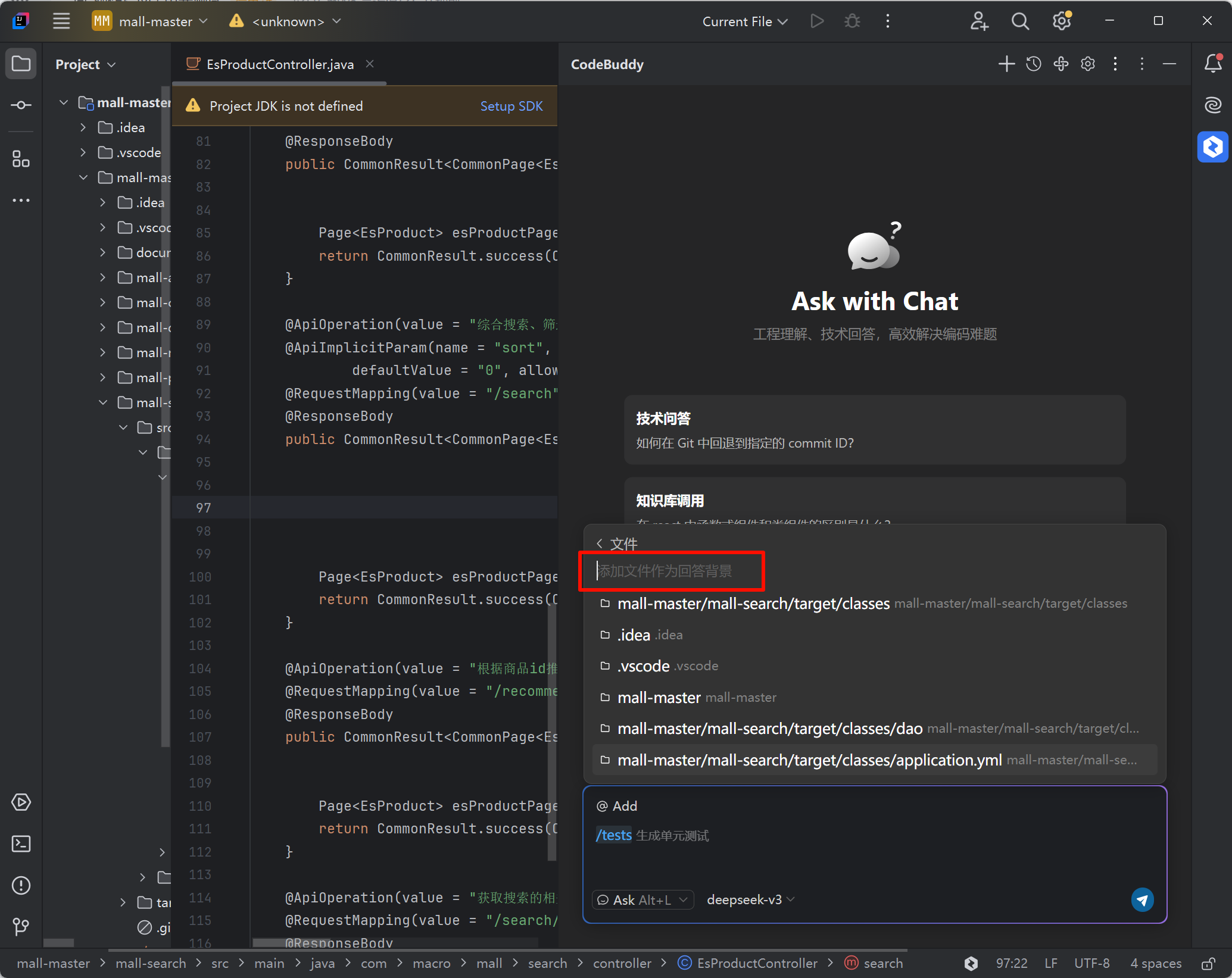 在对话框中,通过 @ 符号将文件/目录添加到对话上下文,触发单元测试生成。