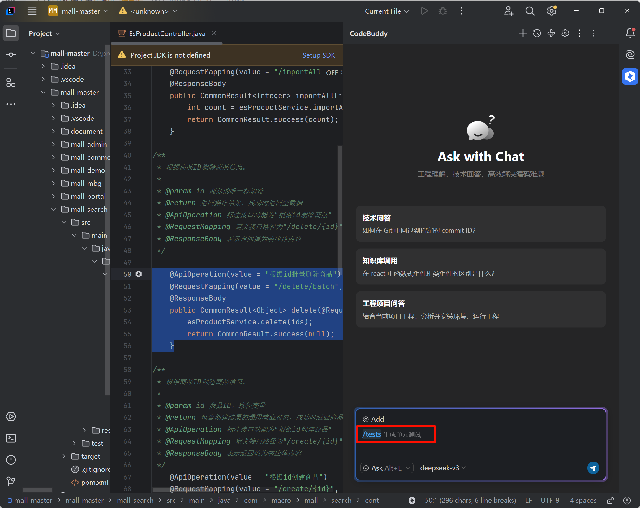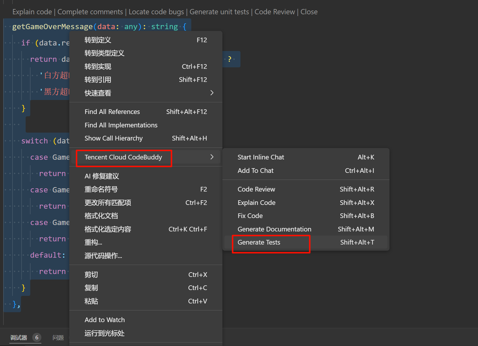 圈选代码后,可以右键选择 Tencent Cloud CodeBuddy > Generate Tests 触发单元测试生成 。