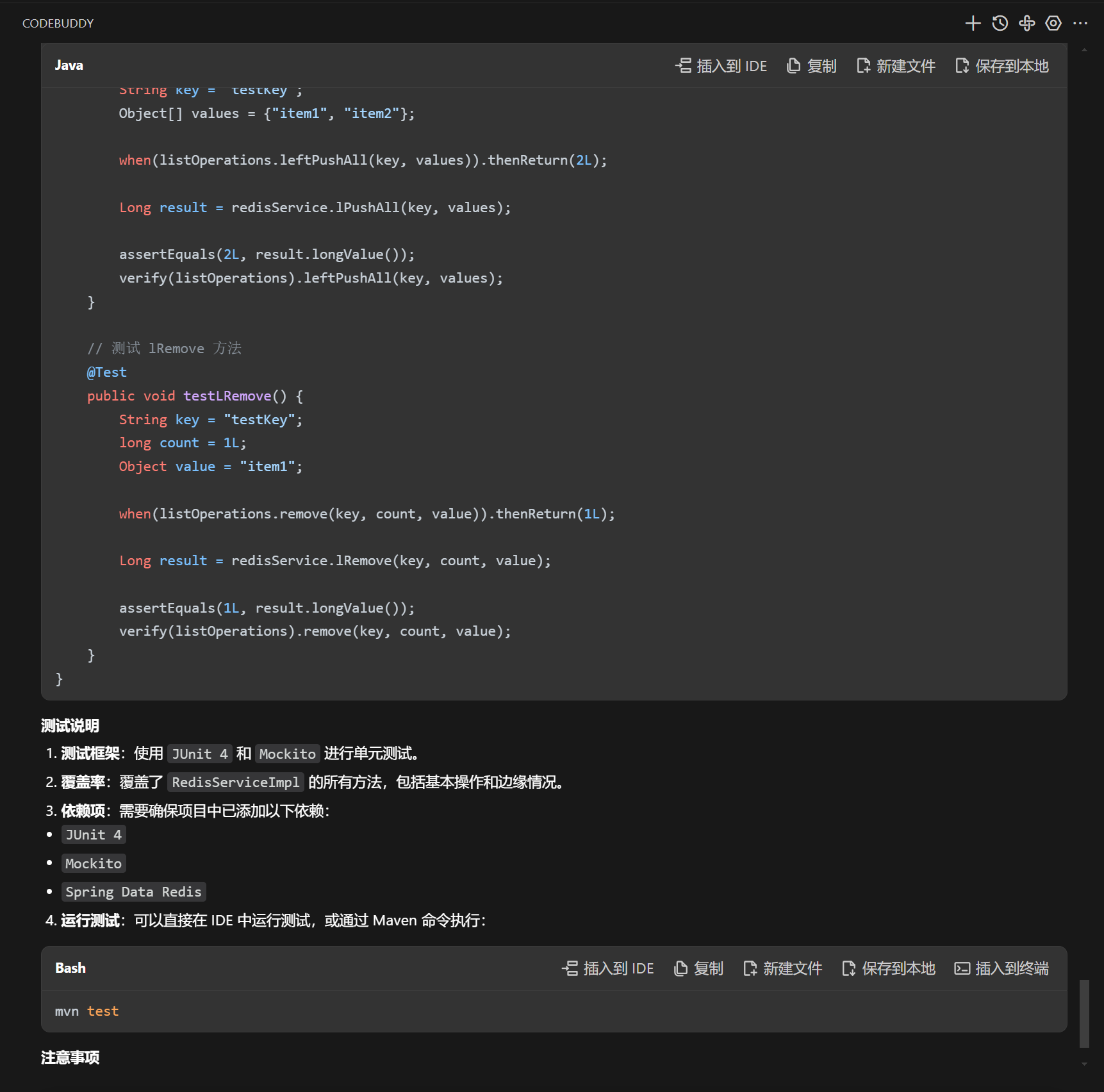 2. 基于对所需测试代码内容的分析后,生成了完整的单元测试代码。此外,还提供了测试说明,以及注意事项等内容,辅助进行测试。
