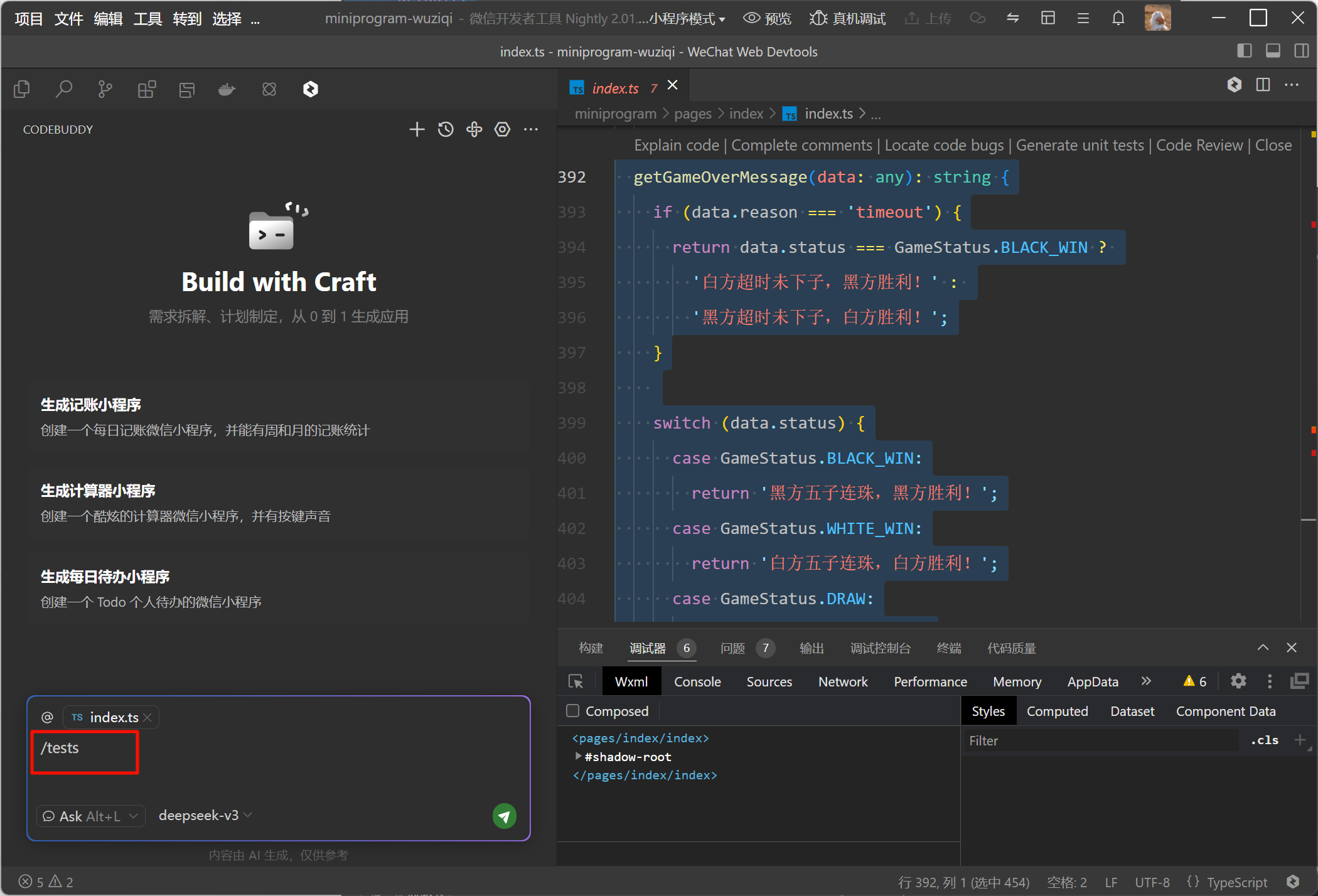 如果你希望 Agent 生成单元测试代码并自动改写文件、运行测试,可以选择使用 Craft 模式;如果希望 Agent 只输出单元测试代码及方案,自己手动应用单元测试代码并运行测试,可以选择使用 Chat 模式。下面以 Craft 模式进行介绍。