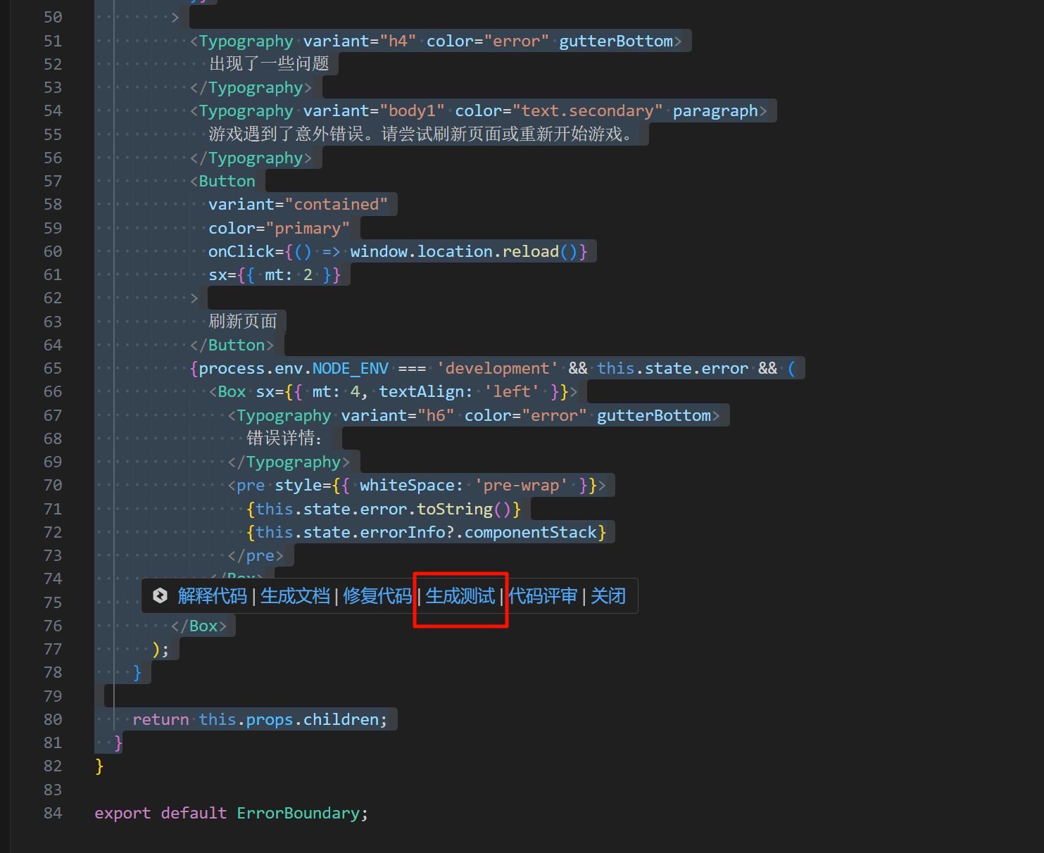 圈选代码后,将鼠标悬浮在代码上,在弹出的悬浮菜单中可以选择 Generate unit tests 触发单元测试生成。