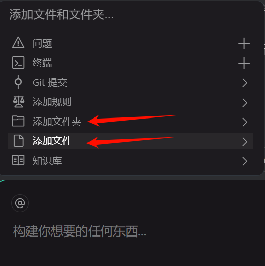 这里文件列表中如果没有需要选择添加的文件或目录,可以使用退格键删除左侧的 @ 字符 ,然后手动单击 @ Add ,选择 File & Folders,此时就可以通过搜索框进行输入搜索。