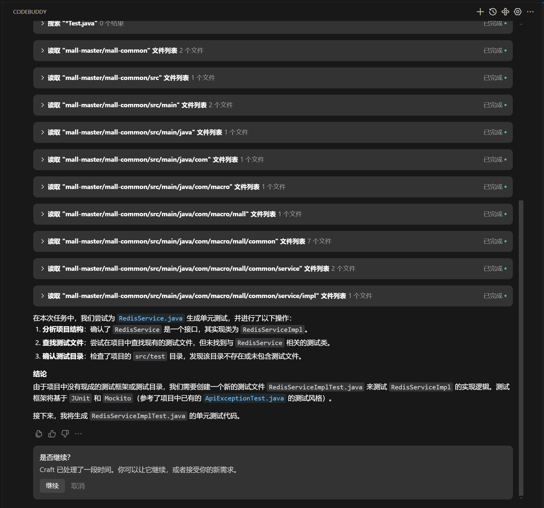 1. 触发单元测试生成后,代码助手会先进行分析项目结构、查找现有的测试文件、确认测试目录等一系列操作。可以点击继续,让代码助手继续生成单元测试代码。