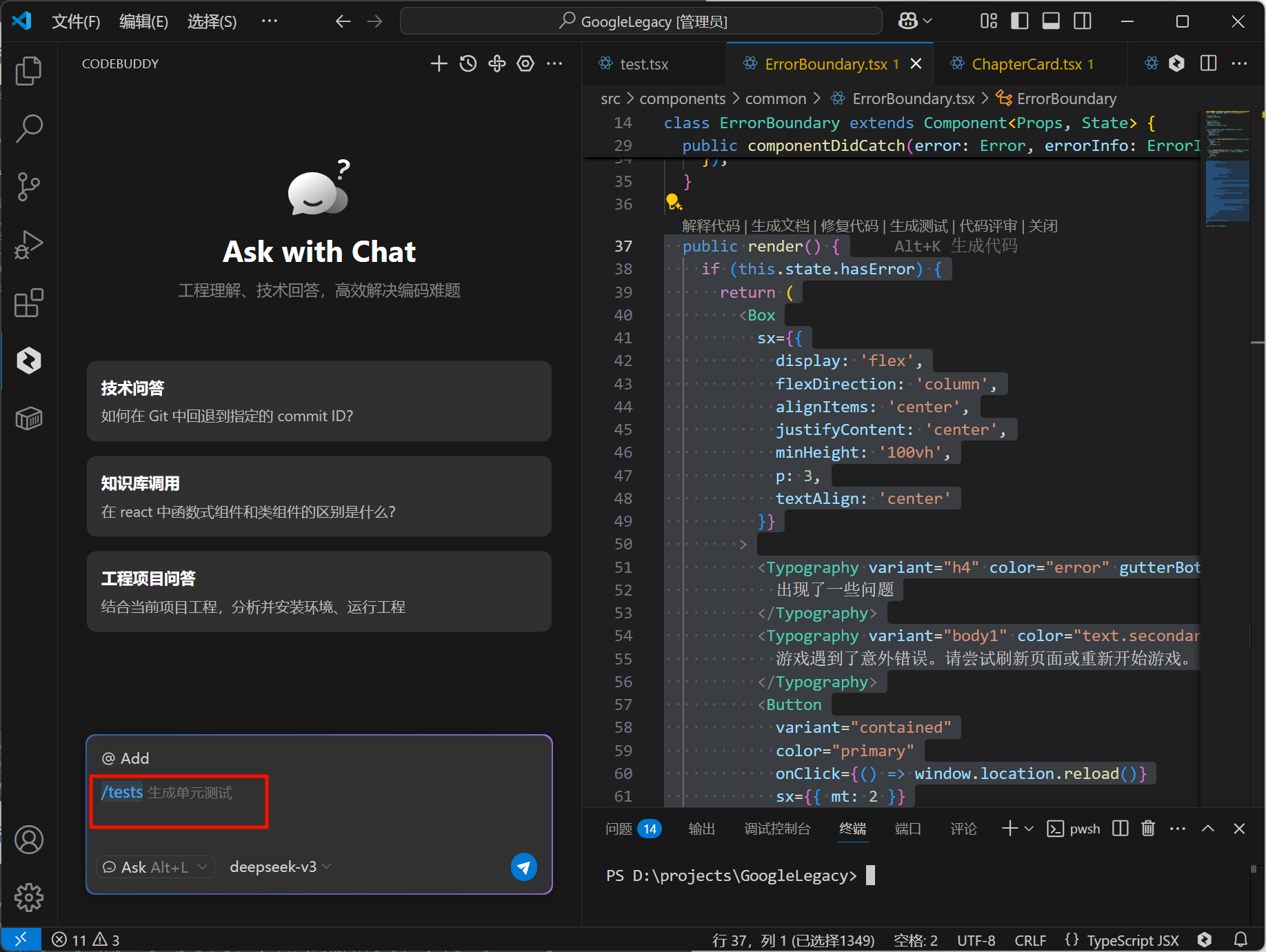 在左侧项目的文件树中,可以右键文件或目录,然后选择腾讯云代码助手 CodeBuddy > 生成测试,即可直接触发单元测试生成。这里也可以选择添加到对话,将文件或目录作为上下文,然后在输入框中通过