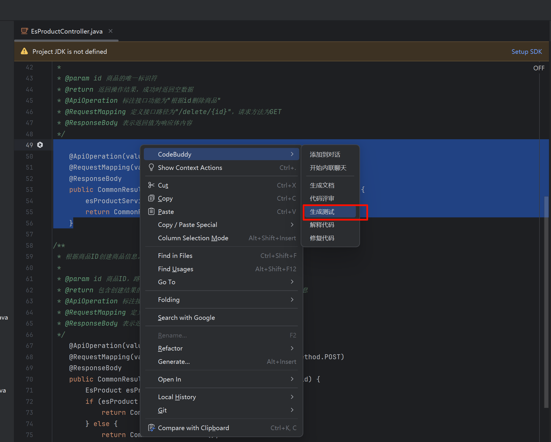 圈选代码后,右键选择 CodeBuddy > 生成测试 直接触发单元测试生成。