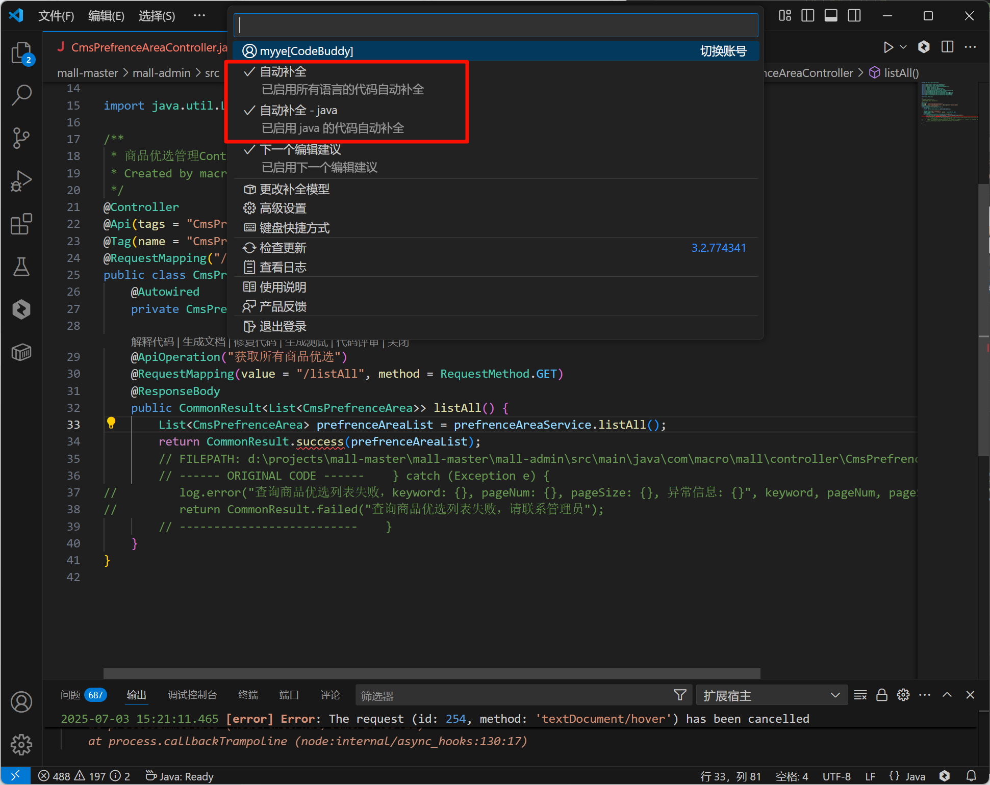 插件会根据光标所在位置合理选择合适的位置进行代码补全,例如插件当光标位置在代码行尾附近位置,或者换行的时候才会触发代码补全。以 VS Code 为例 JetBrains IDE 同理)。