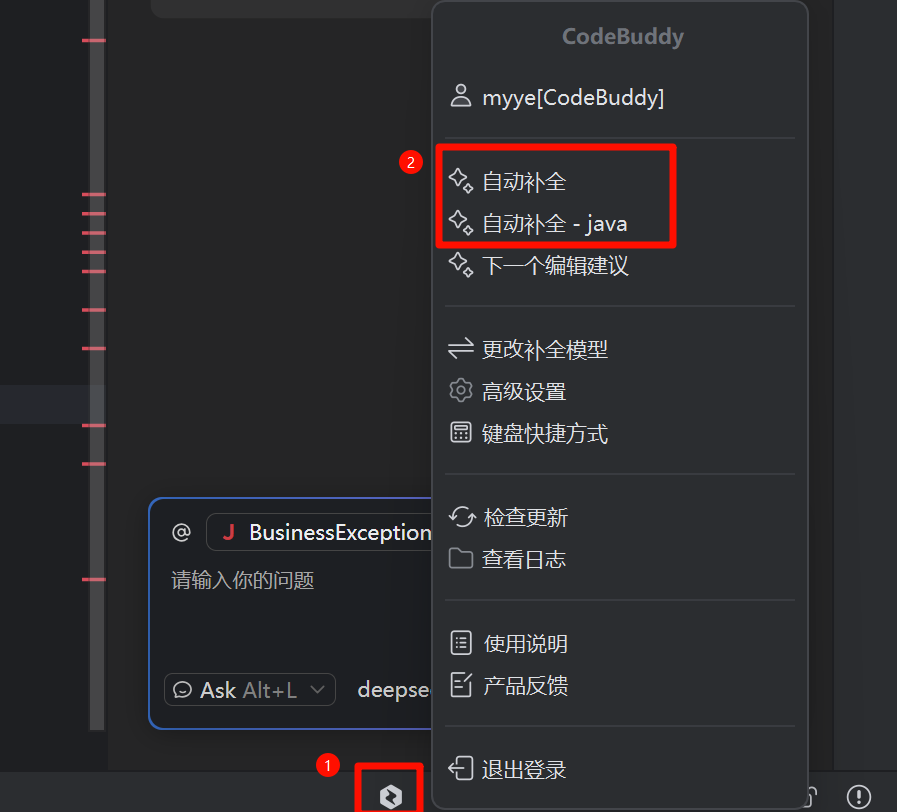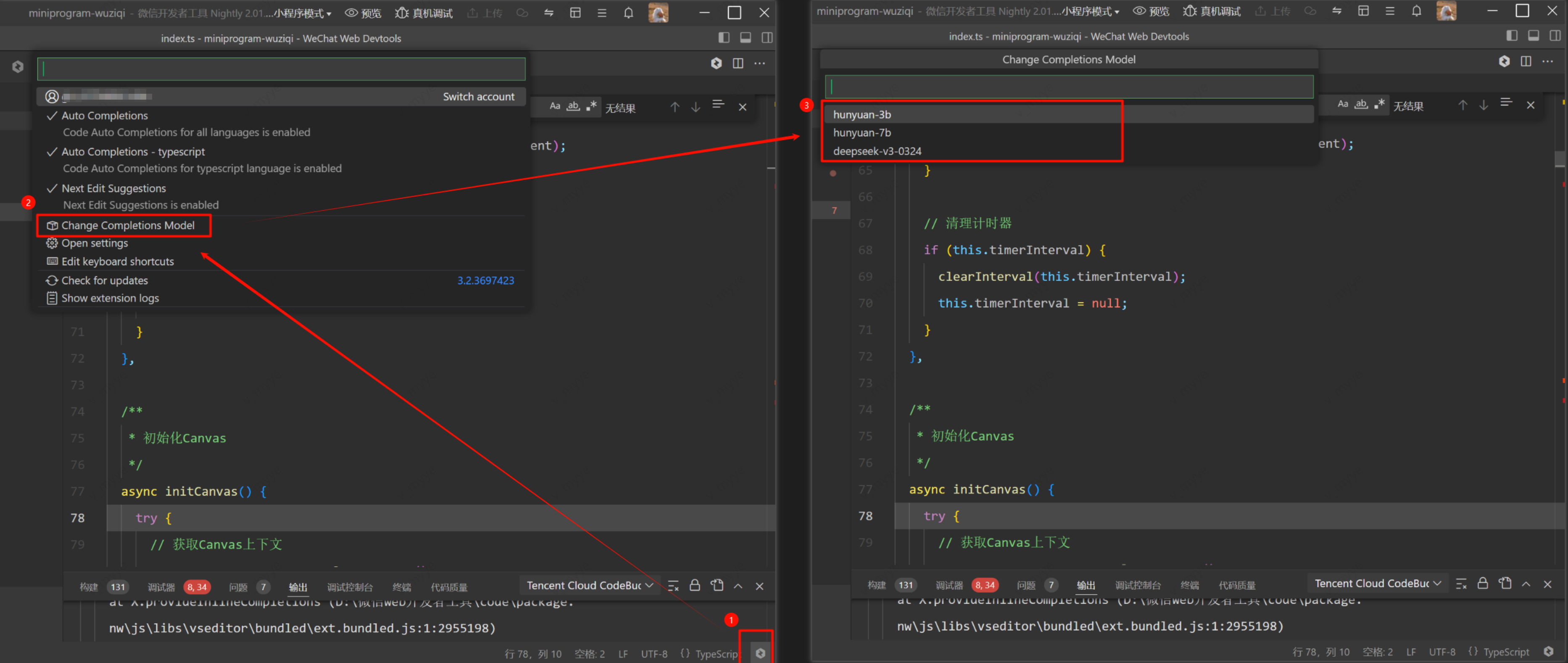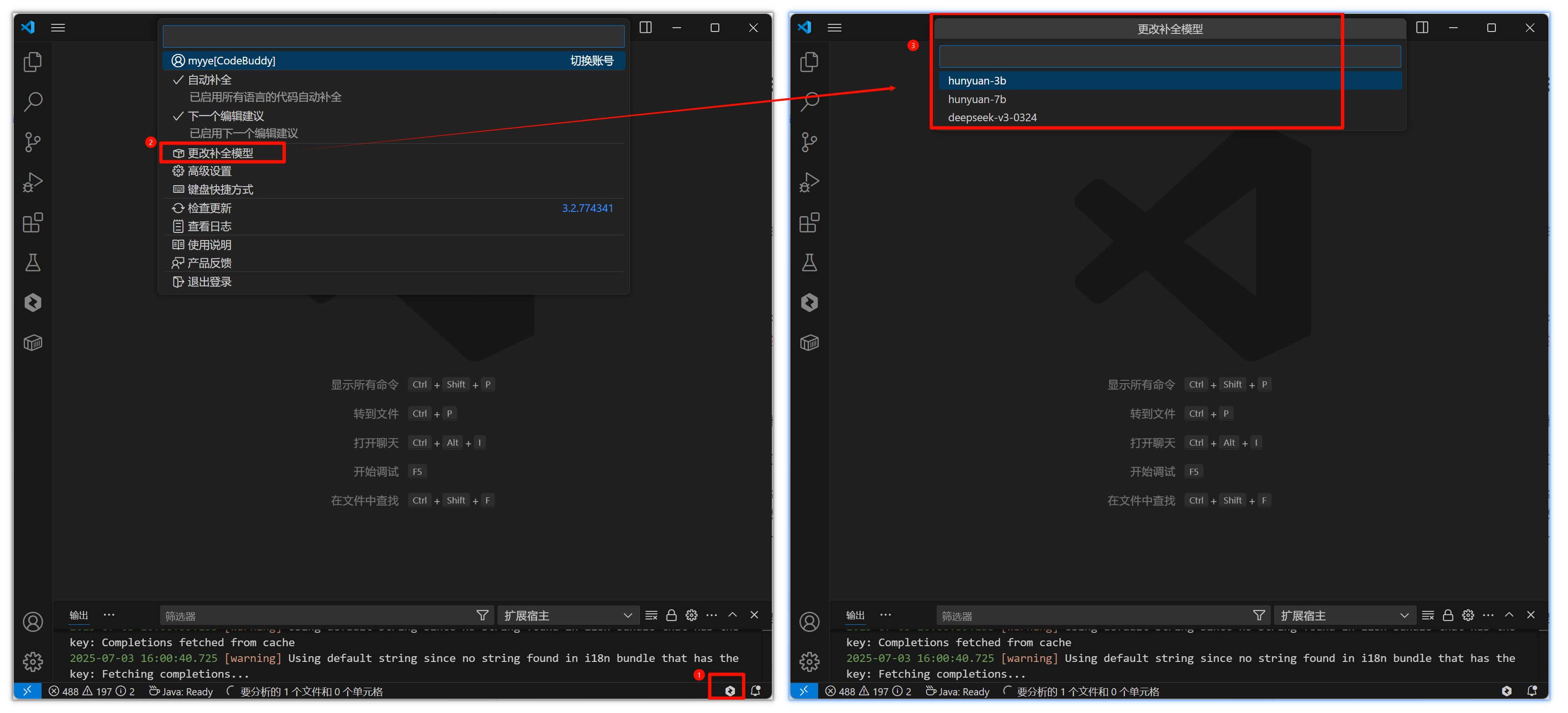 代码助手支持 hunyuan 和 deepseek 补全模型的切换,您可以根据具体场景灵活选择合适的补全模型,提升开发体验和效率。切换模型的操作如下图所示。