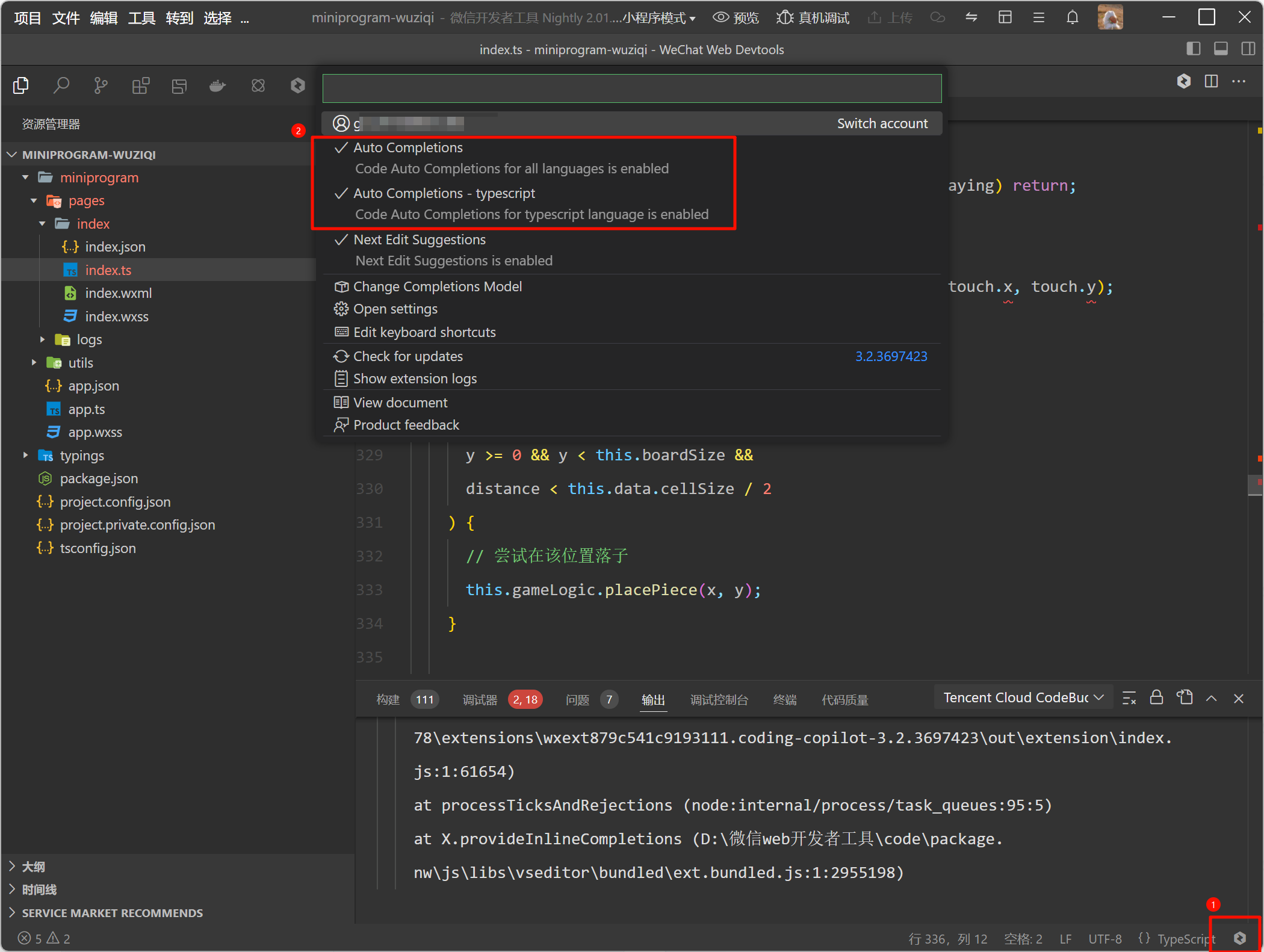 禁用和启用补全功能:单击状态栏的插件小图标,可以启用或者禁用插件代码补全功能,如下图所示。