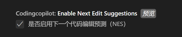 补全 pro 能力,即下一个编辑建议,NES (Next Edit Suggestions),不仅可以对当前光标处的代码进行补全,也可以对其它相关地方的代码进行补全,即预测开发者接下来要写的代码,并提前给出建议,具有“前瞻性”的核心特点,实现更好的补全效果。默认为开启状态,支持自动触发和手动触发,手动触发的快捷键为 Windows:Ctrl + Shift + Enter,Mac:⌘ Command + ⇧ Shift + Enter。
