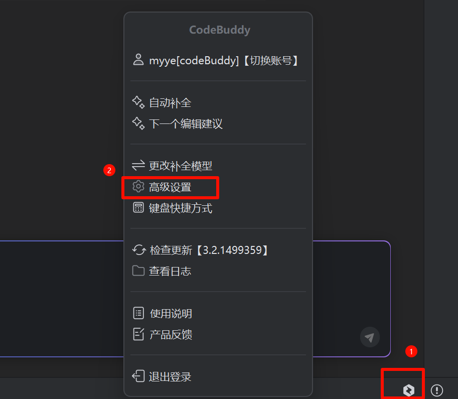 1. 单击底部腾讯云代码助手的 icon 按钮,在弹出菜单中选择高级设置进入。
