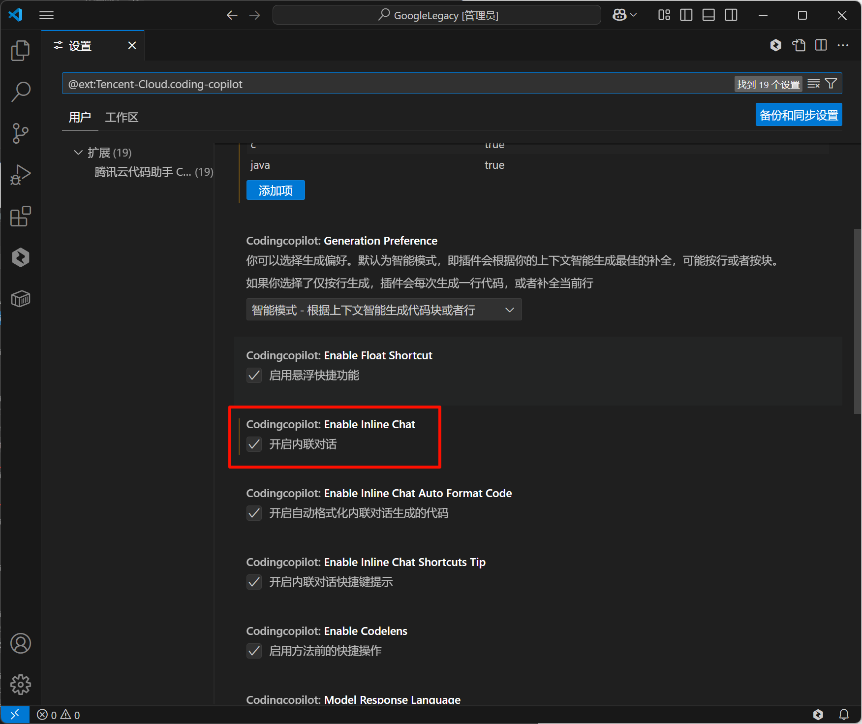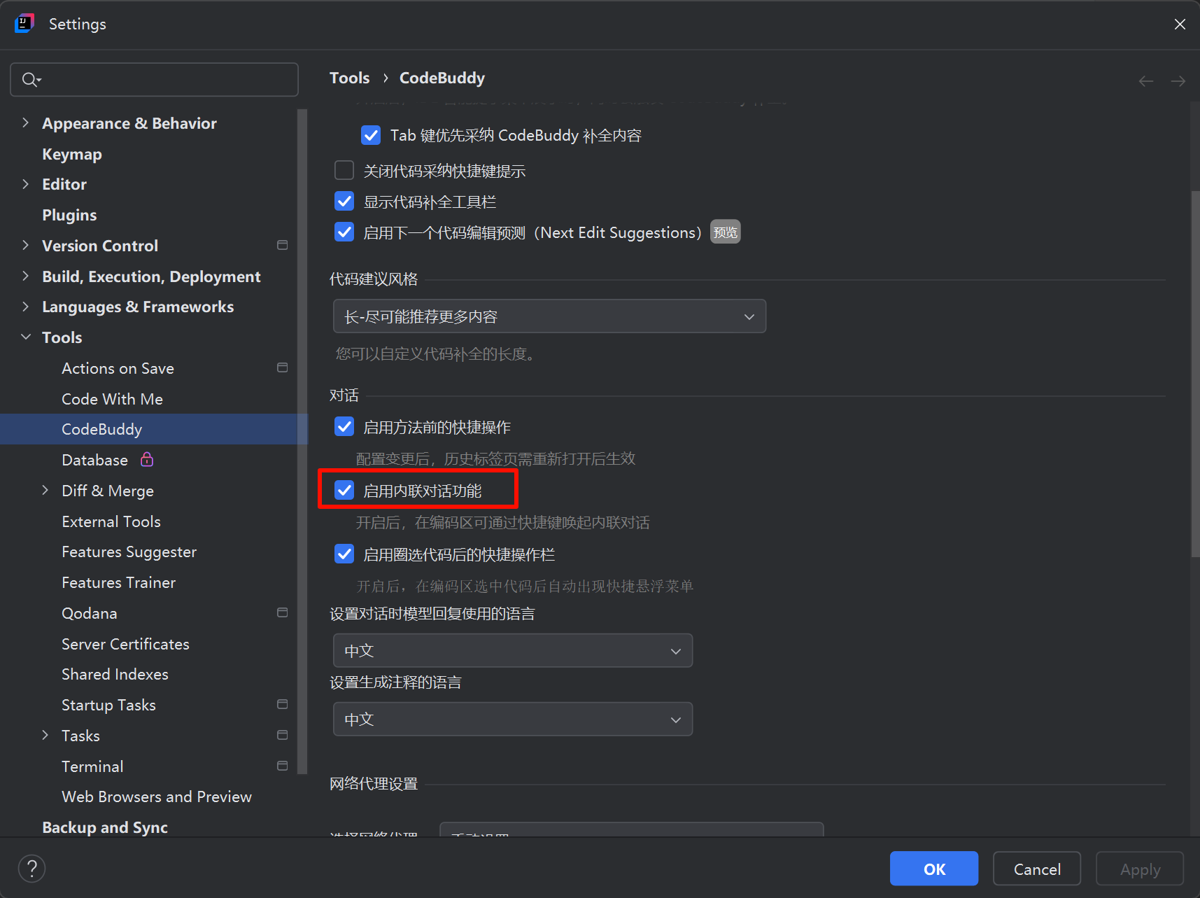 2. 确认启用内联对话功能已开启。