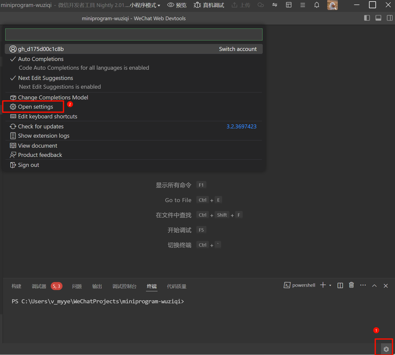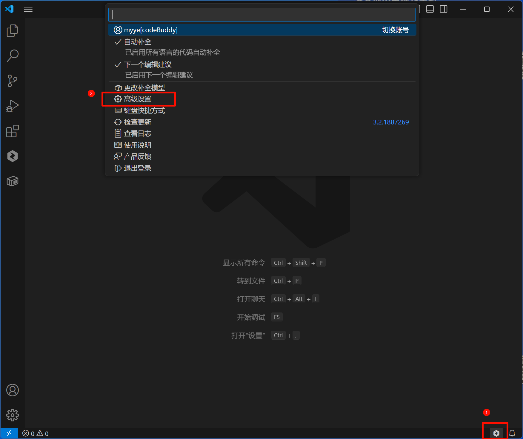 1. 单击底部腾讯云代码助手的按钮,弹出菜单条,选择高级设置进入。