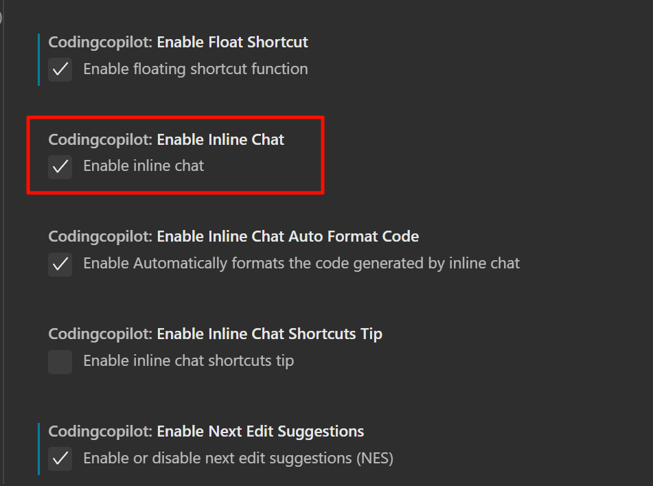 2. 确认 Enable Inline Chat 已经开启。