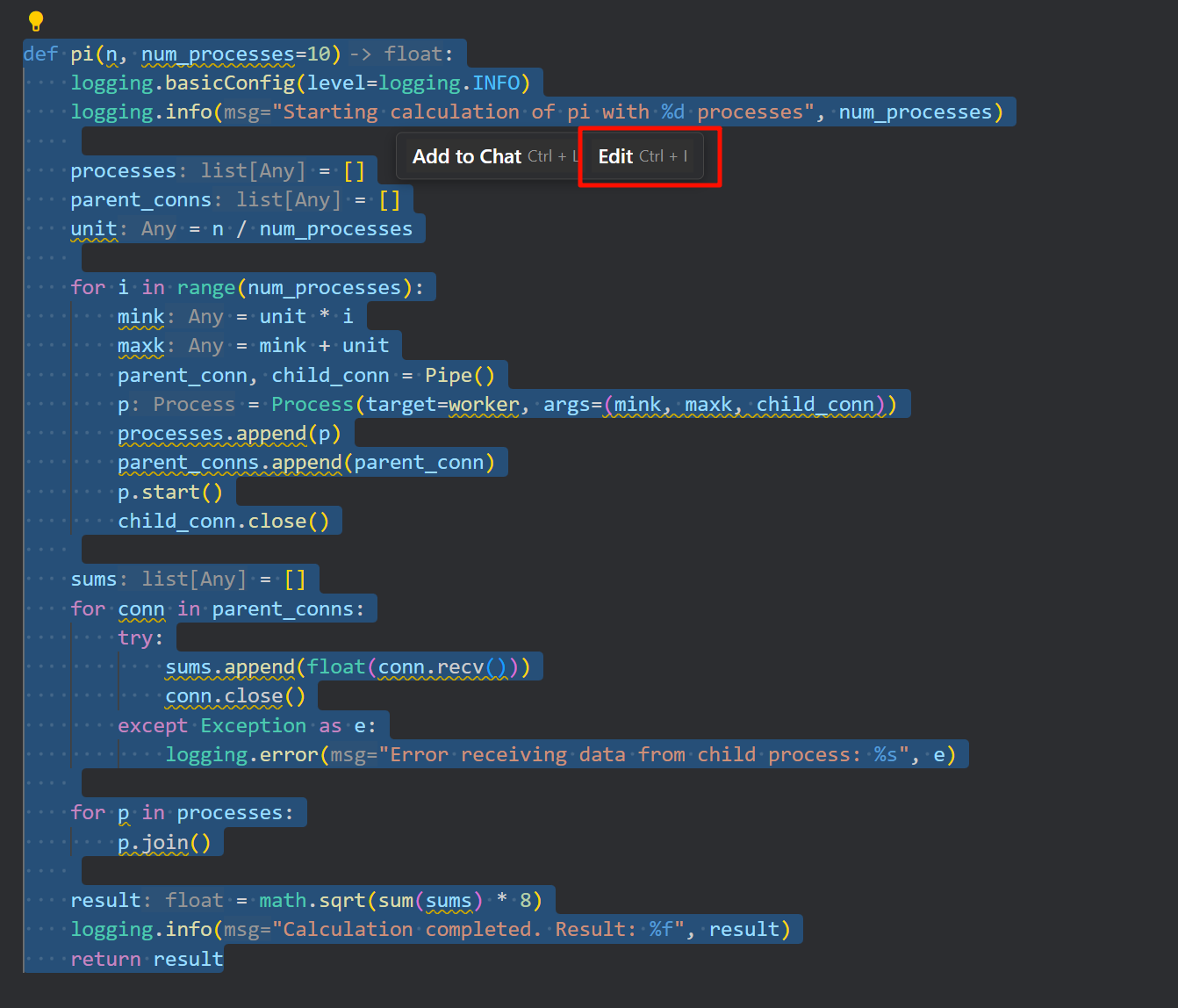 在 CodeBuddy IDE 中,内联对话功能已经默认开启,你可以圈选代码块后在弹出菜单中单击 Edit 按钮,也可以直接通过右侧提示的快捷键(Windows:Ctrl + I,Mac:⌘ Command + I)快速唤起内联对话输入框。唤起对话输入框后,可以通过快捷键 Escape 退出。