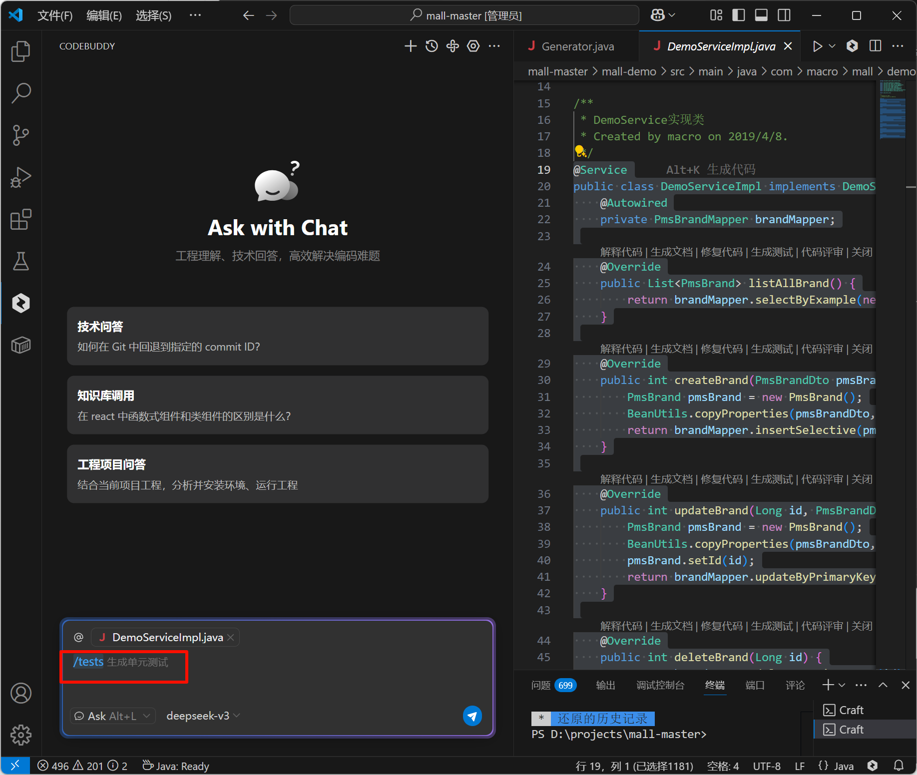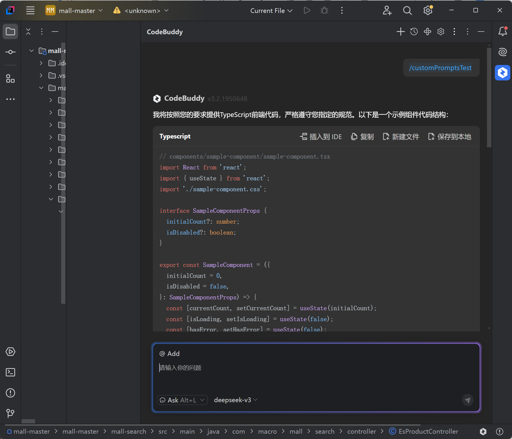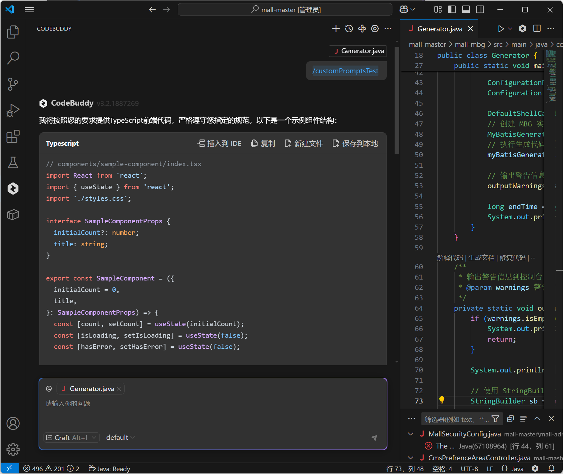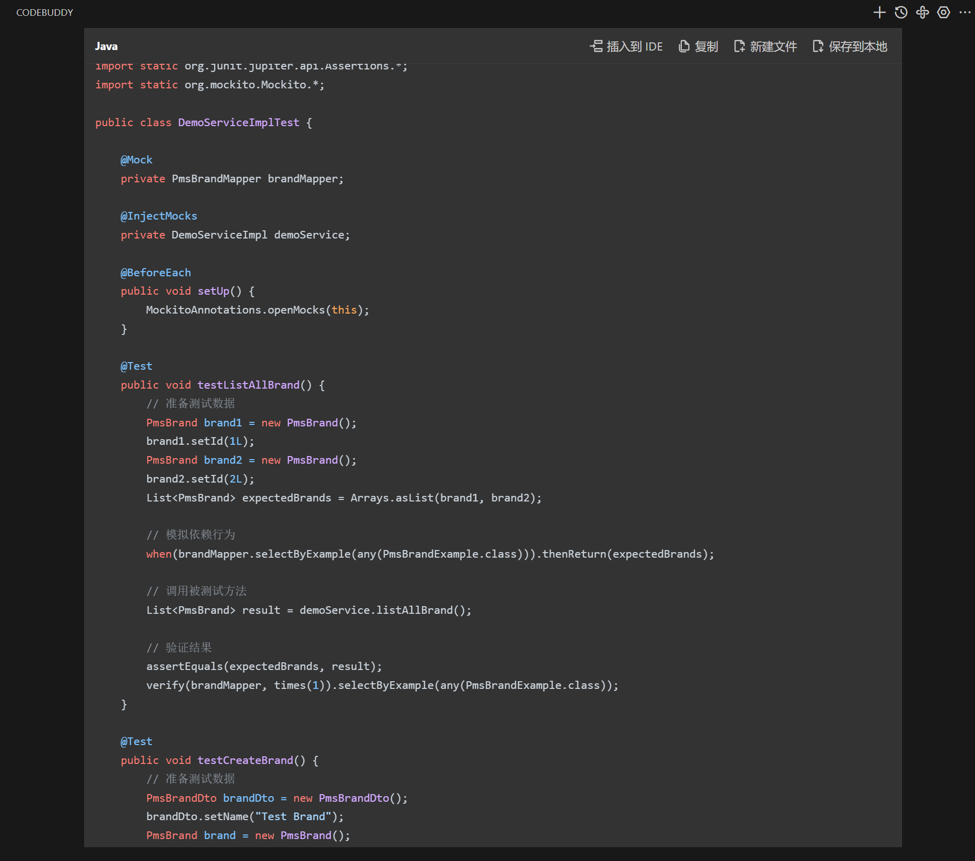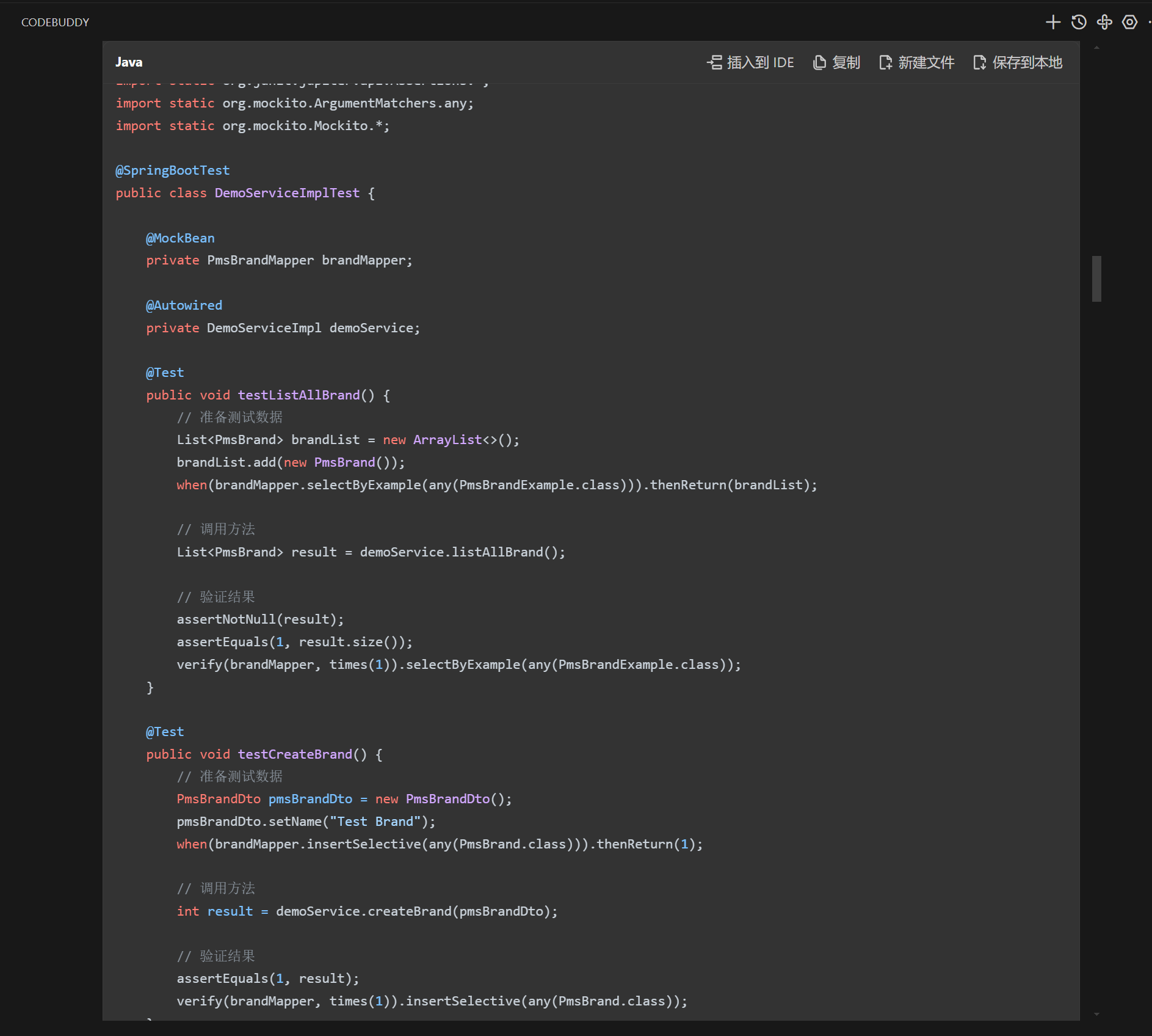 从上图的输出结果中可以对比看到,所添加的全局提示词已经被应用到对话中,增加了 SpringBootTest 来编写单元测试。