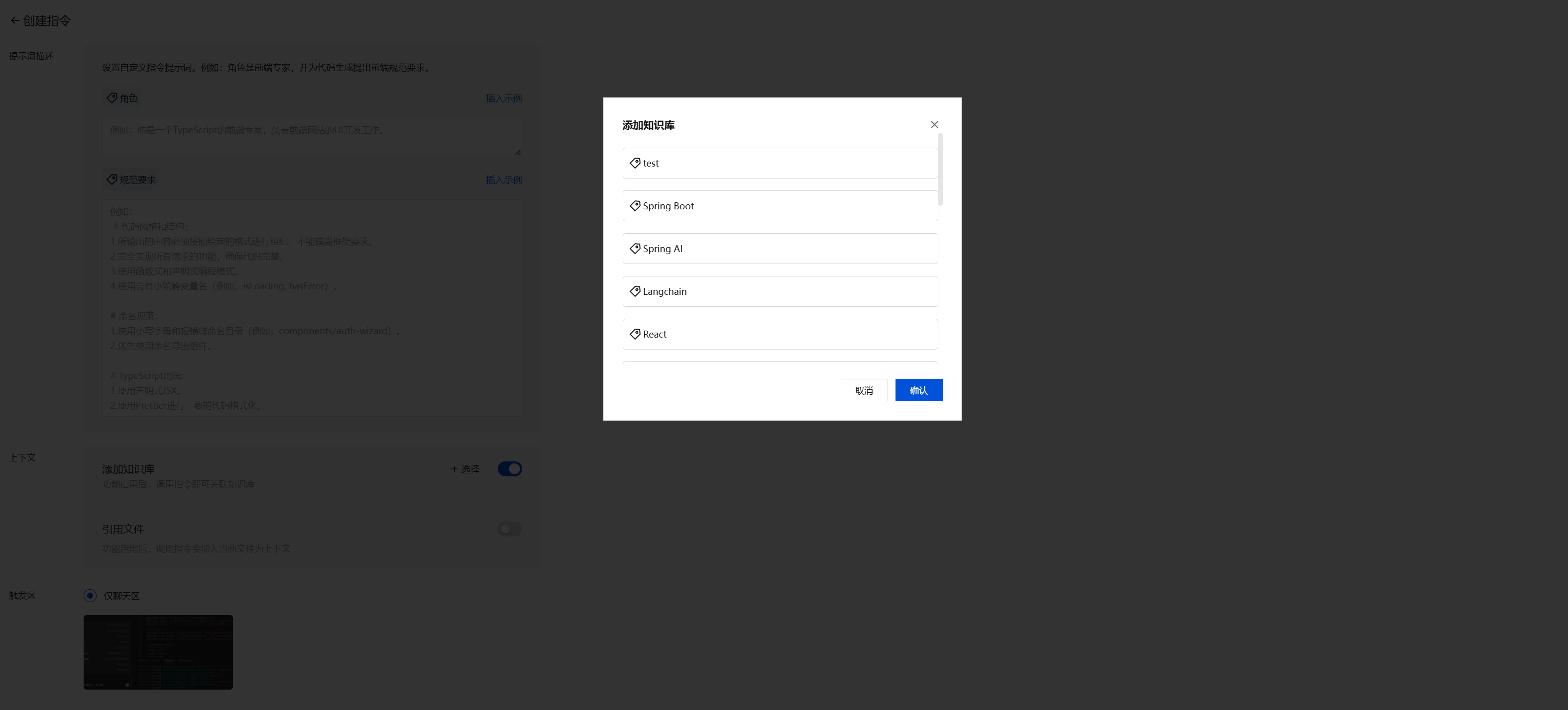 可以选择添加或不添加知识库,如果选择添加知识库,那么调用该自定义指令后即可关联知识库,增强生成质量。添加知识库可以按照如下2步进行: