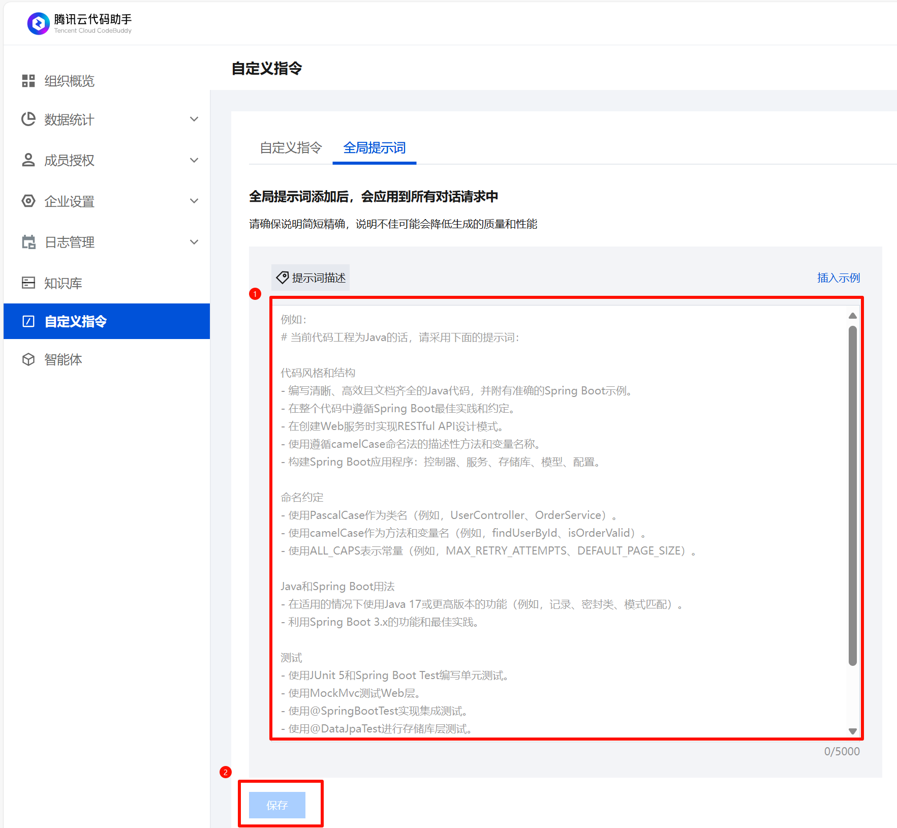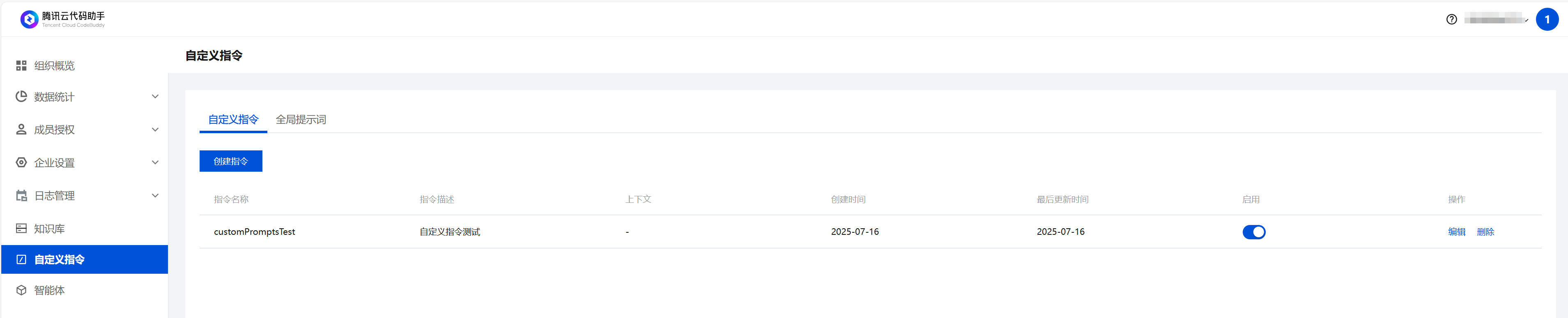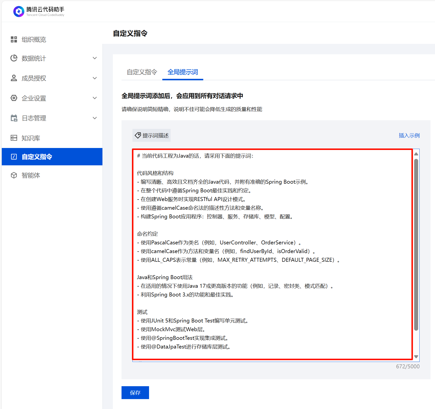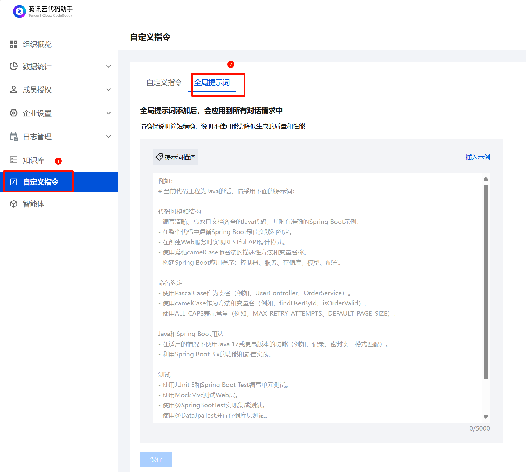 腾讯云代码助手新增了管理端创建和管理提示词的功能,包括自定义指令和全局提示词。