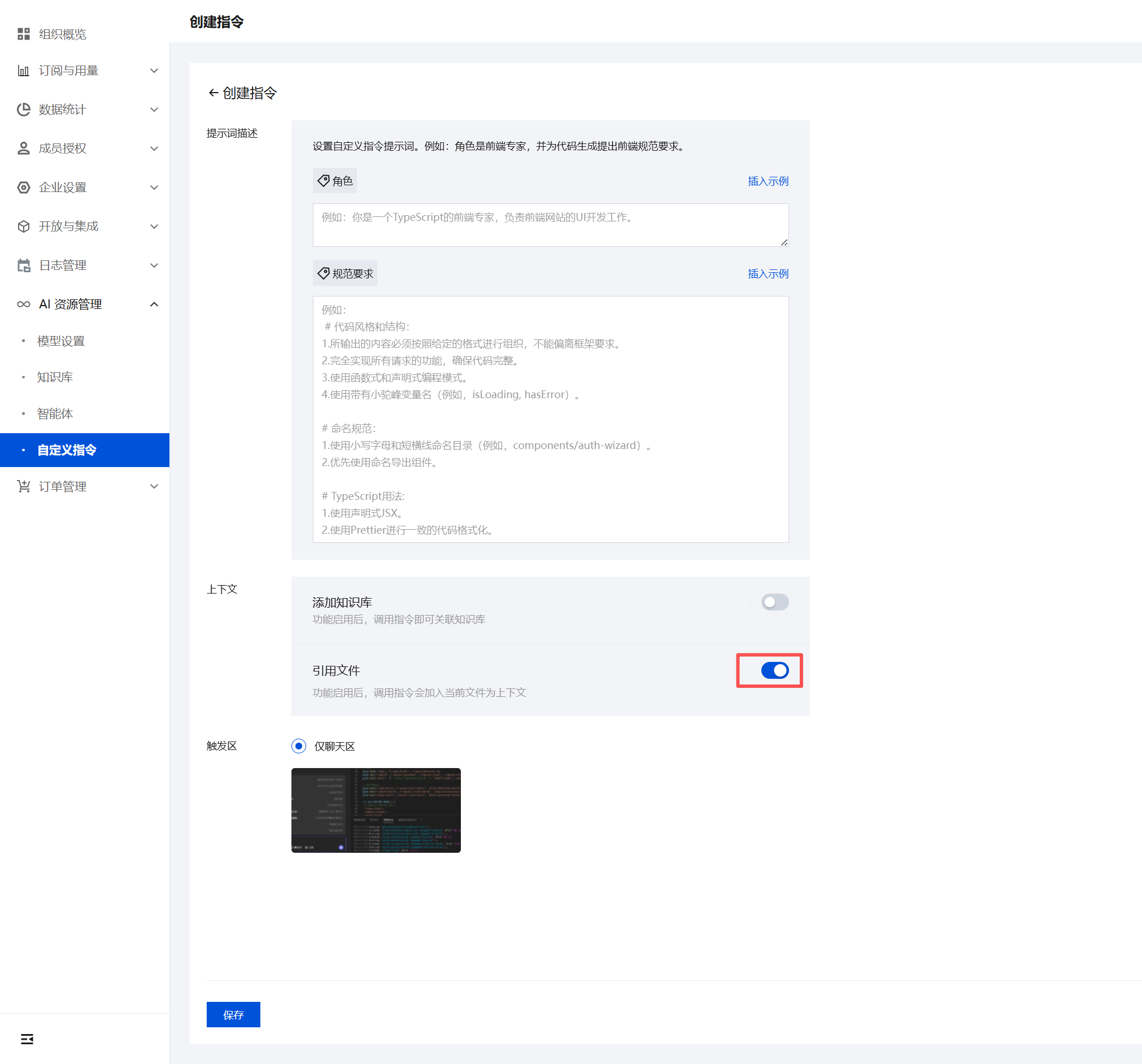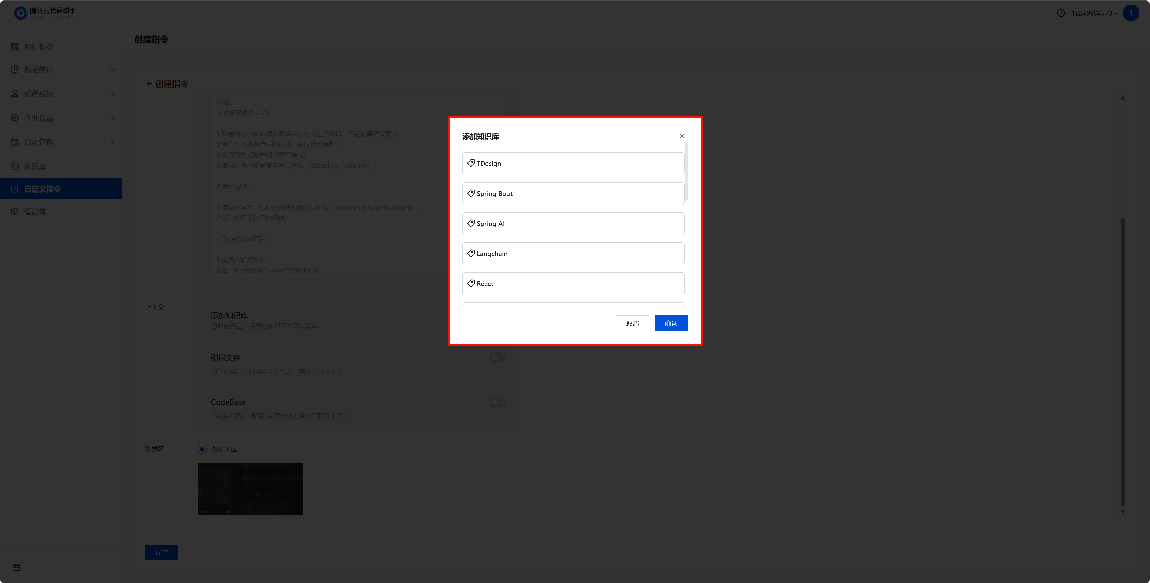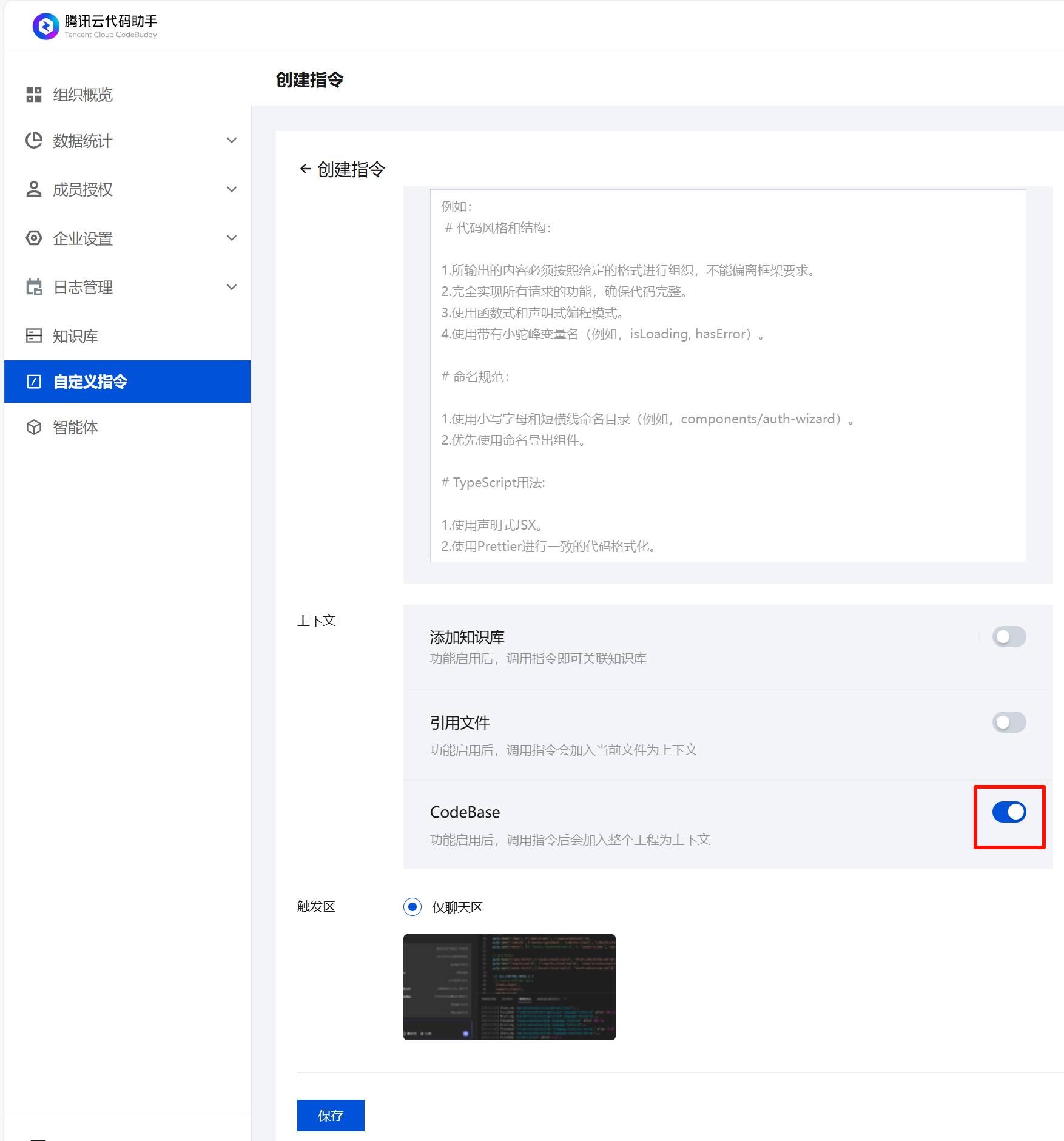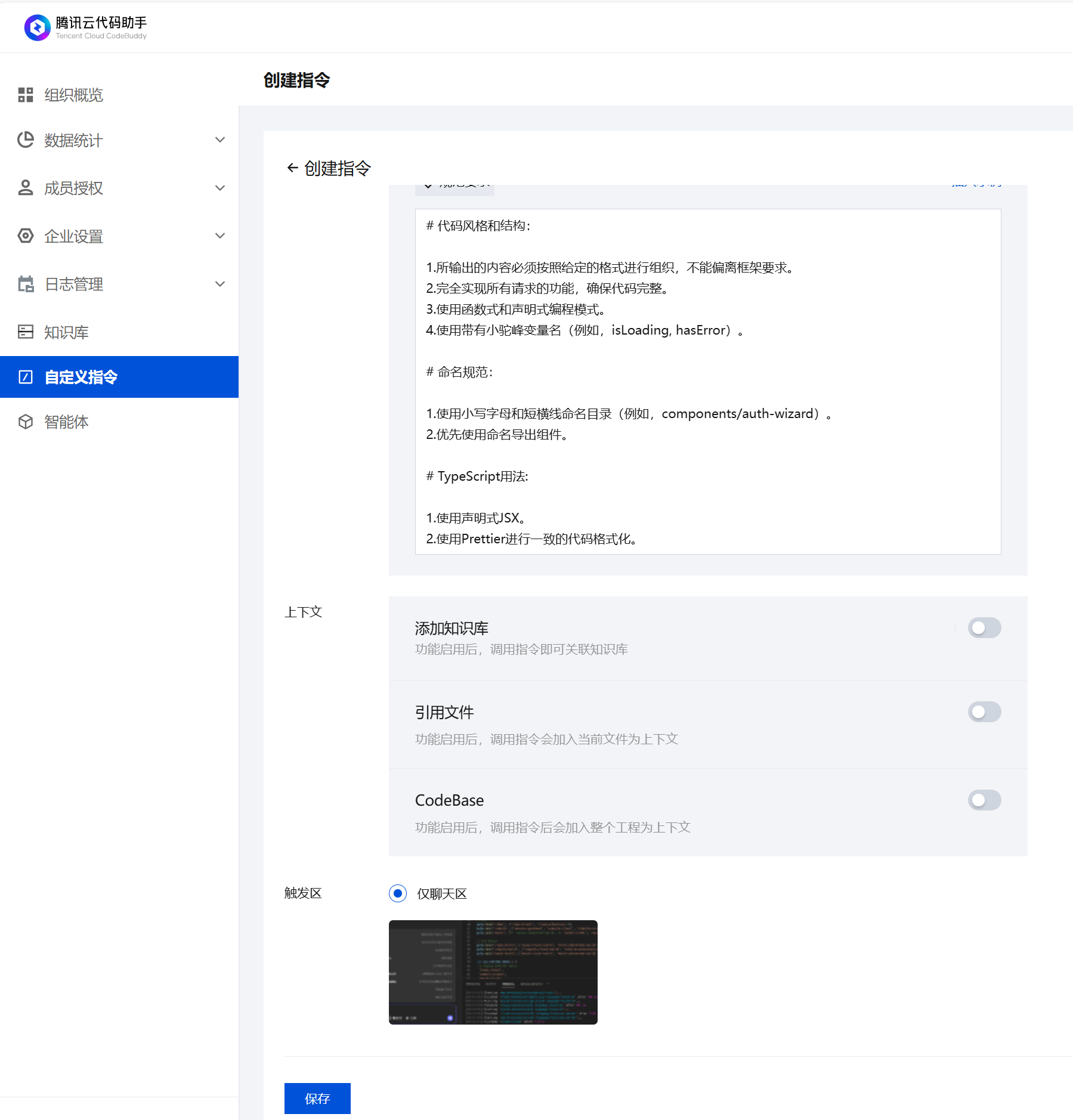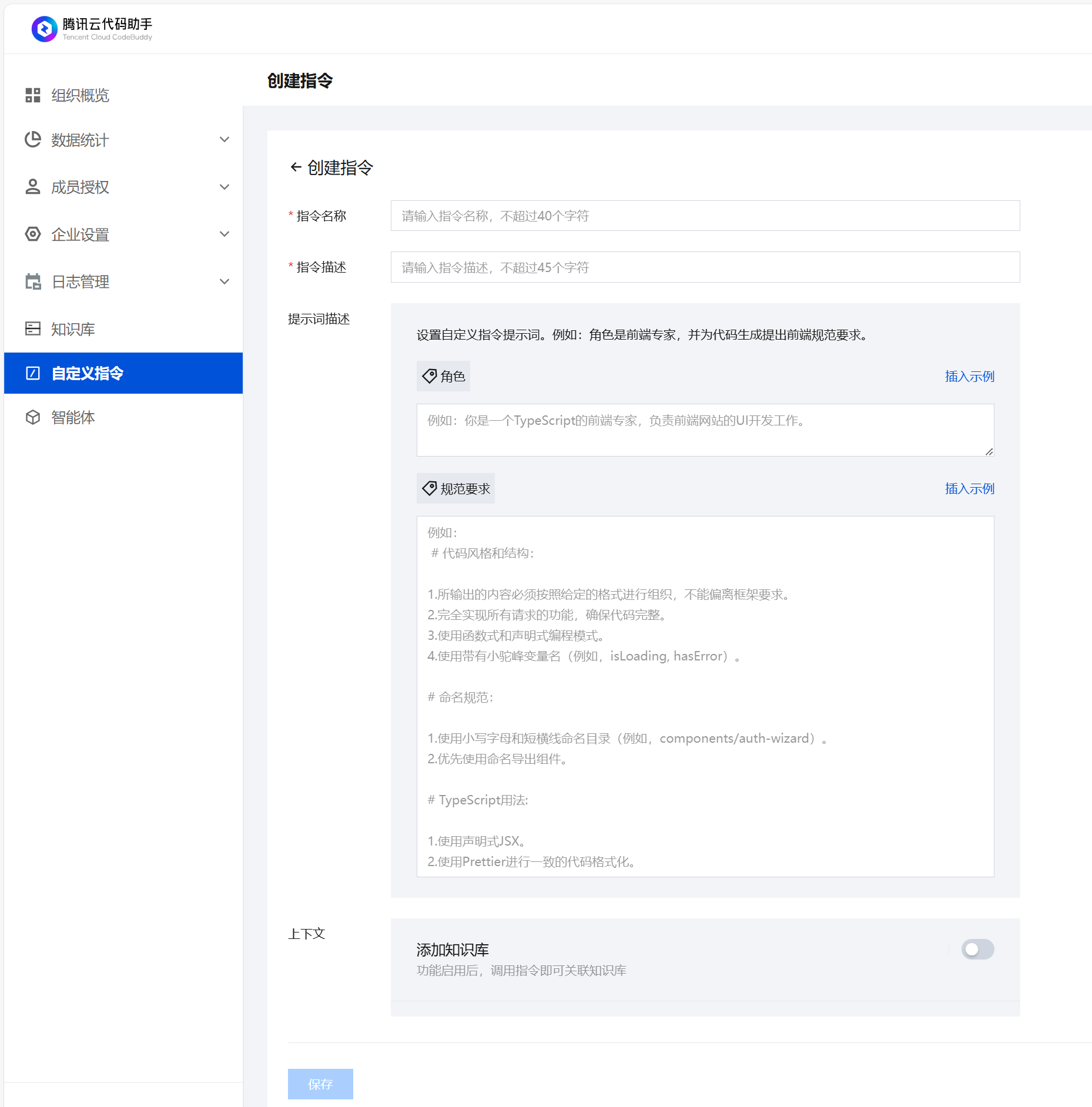 腾讯云代码助手新增了管理端创建和管理提示词的功能,包括自定义指令和全局提示词。
