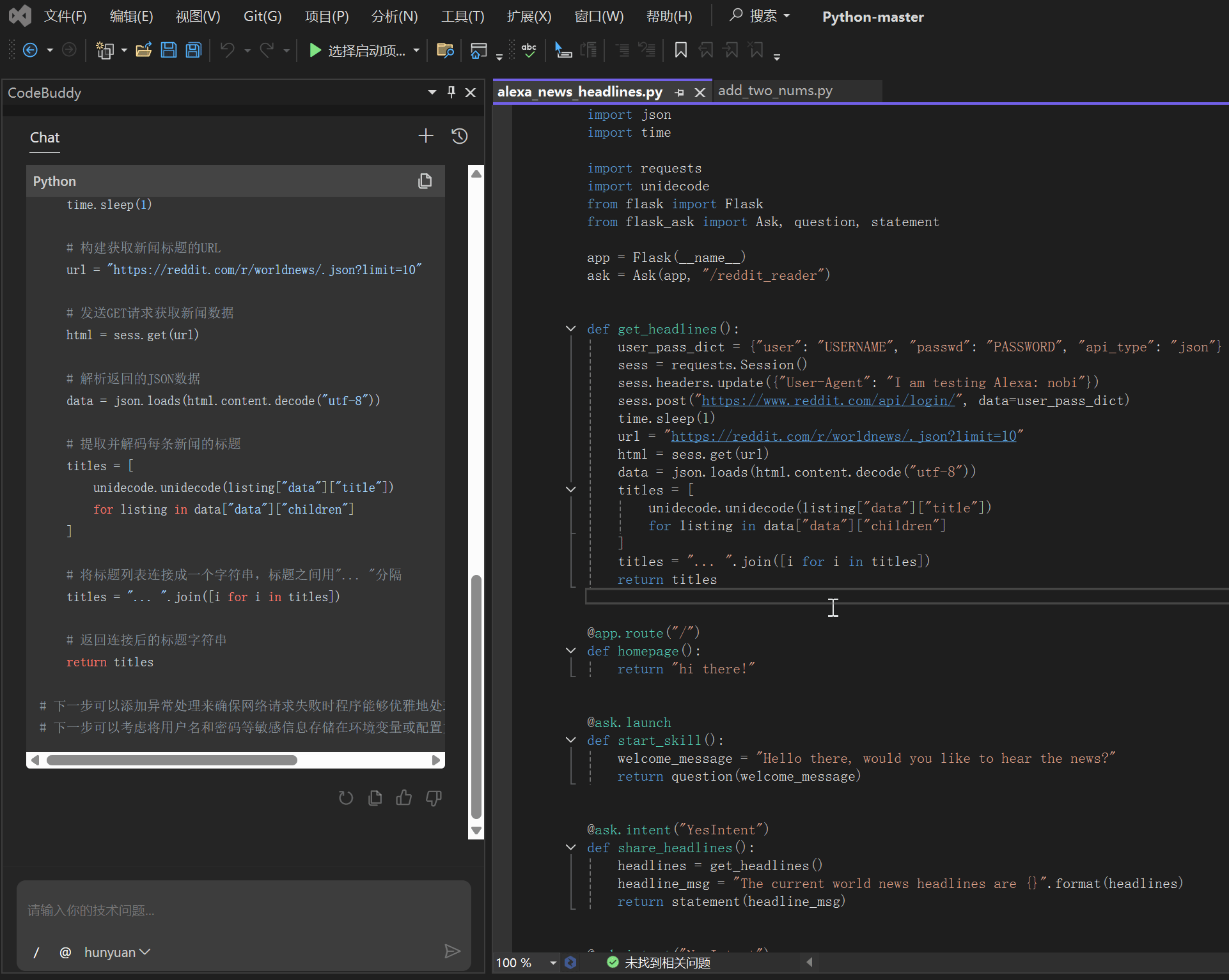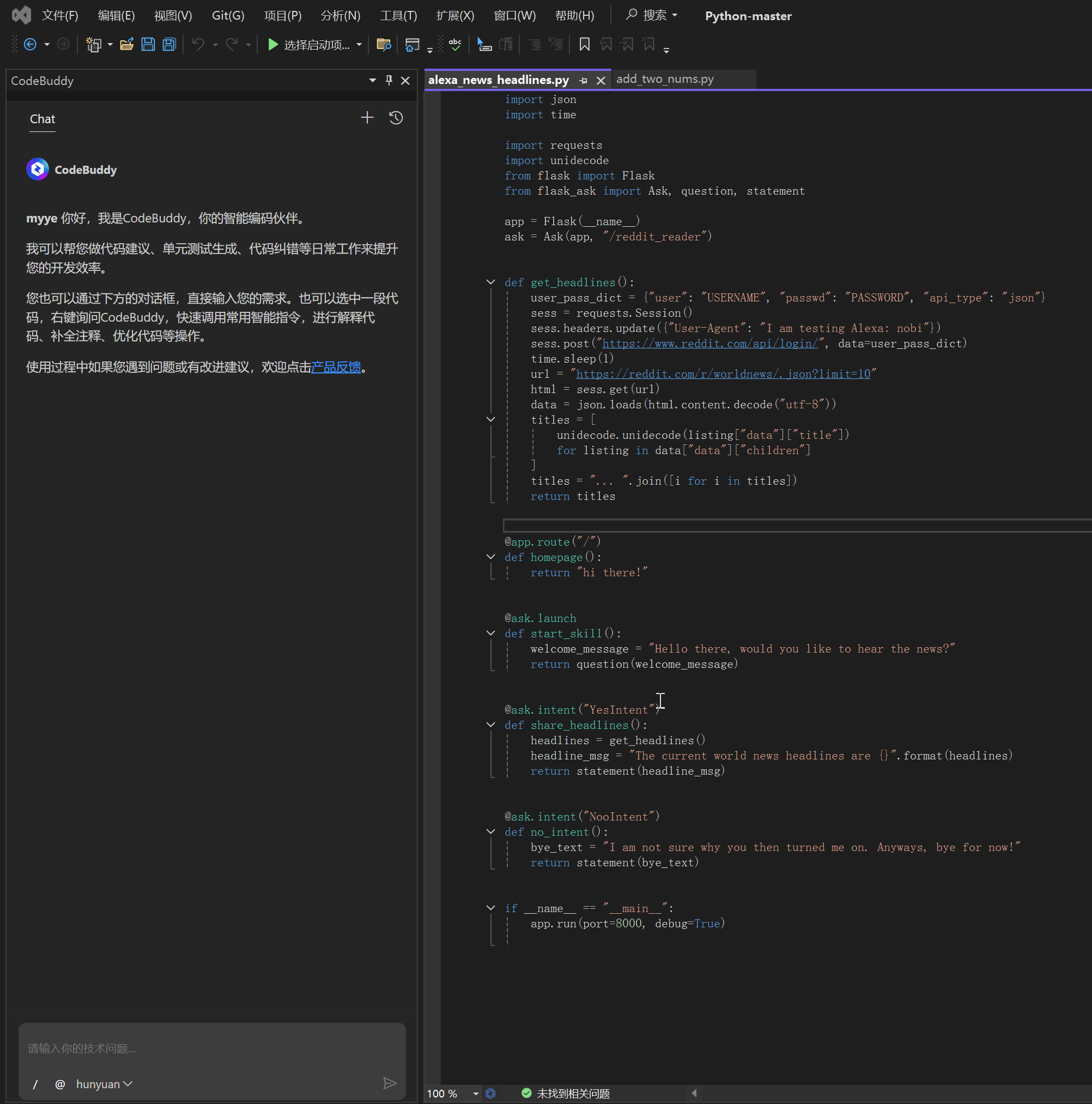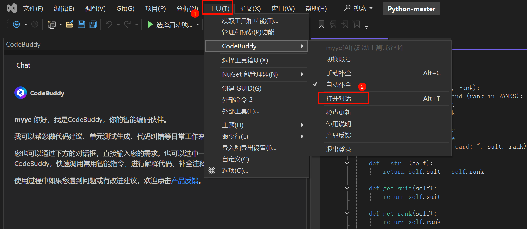 登录后,可以通过工具 > CodeBuddy > 打开对话进行技术对话。