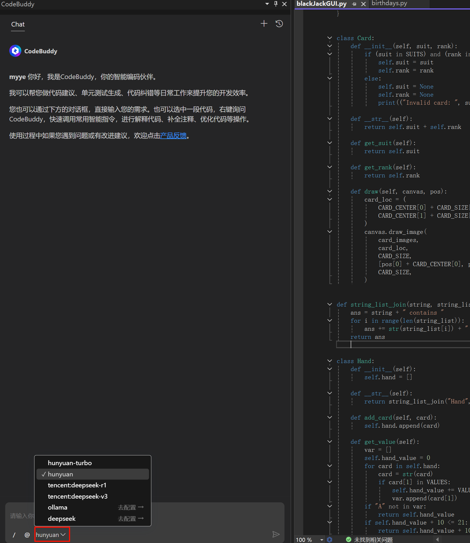 腾讯云代码助手除了内置腾讯自研的混元大模型之外,目前已经部署了官方 deepseek -r1模型,默认是混元大模型。在左侧对话面板中,有一个模型选项可以支持您自由选择对话模型进行切换。