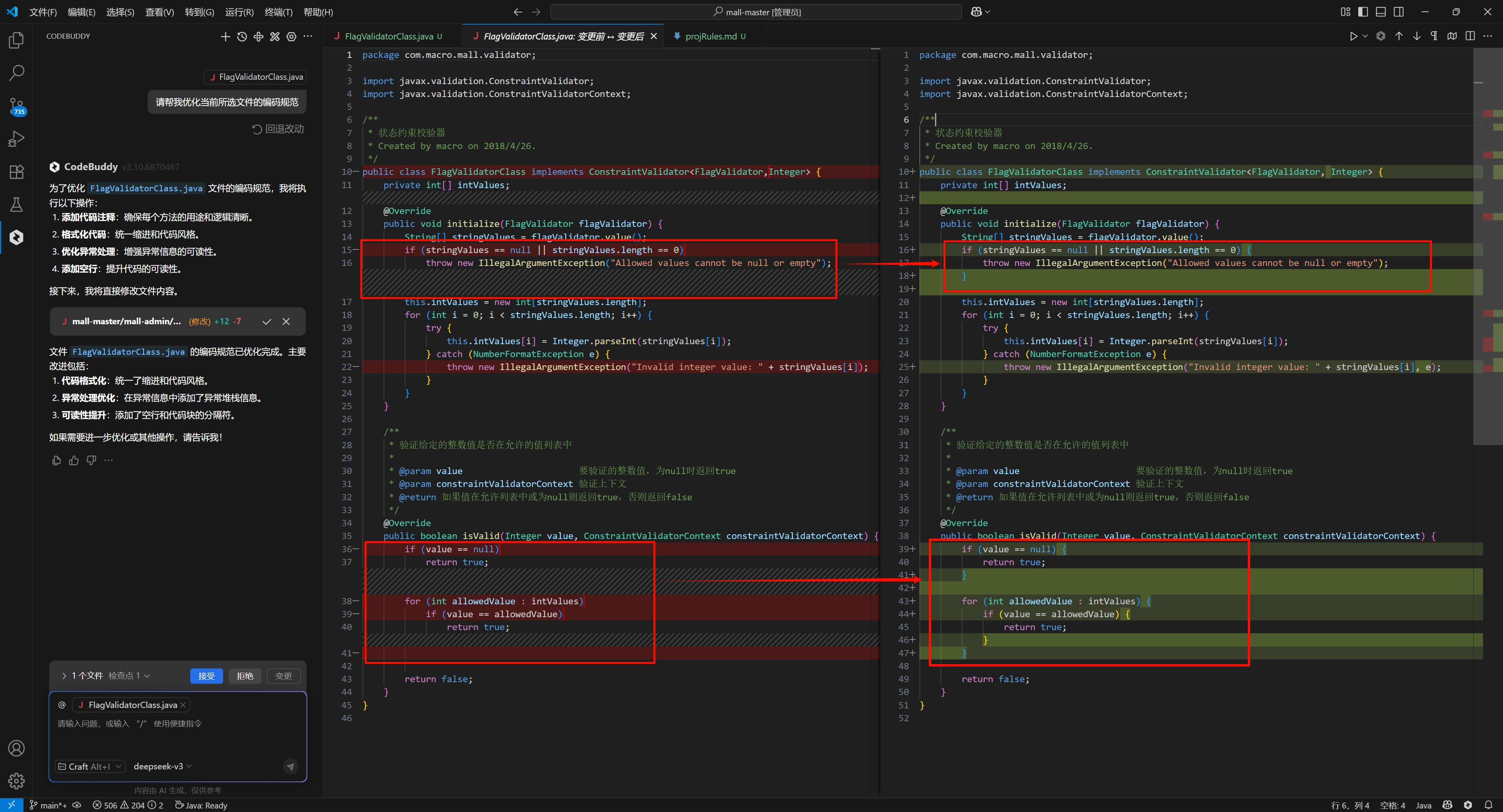 应用 Rules 后的效果如下,可以看到,Agent 根据 Rules 中的 “大括号规范”进行了格式规范的优化。