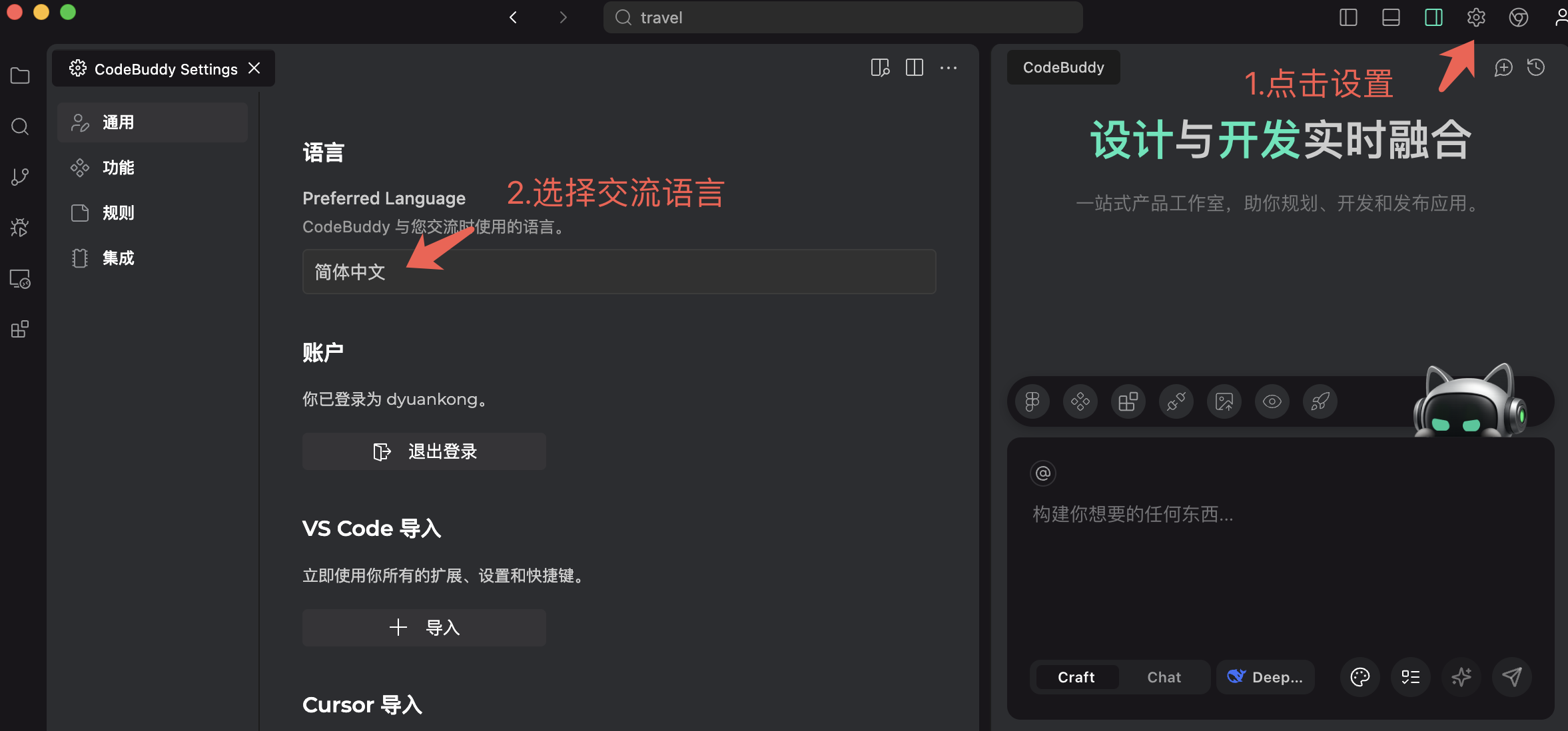 目前 CodeBuddy IDE 支持中文和英文两种语言,可以通过单击配置进行切换。