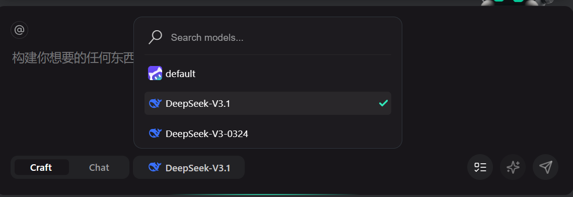 在 CodeBuddy IDE 中 ,提供 Default(hunyuan) | DeepSeek-V3.1 | DeepSeek-0324 等国内多种模型,支持用户自主切换。