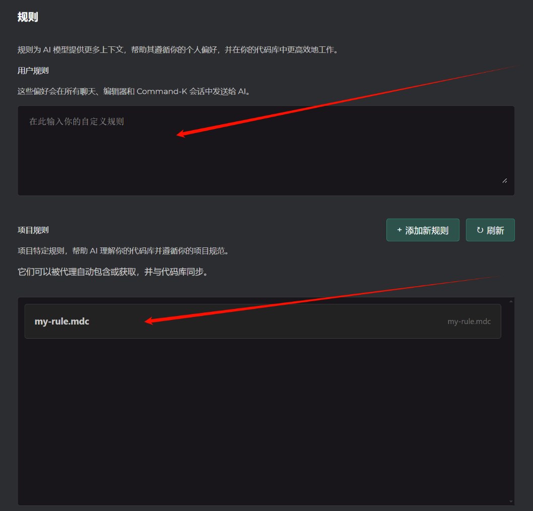 alwaysApply:控制 Project Rules 的应用范围和触发条件,当为 true 时规则会应用到整个项目的所有文件中,当为 false 时只对 globs 定义的路径有效。