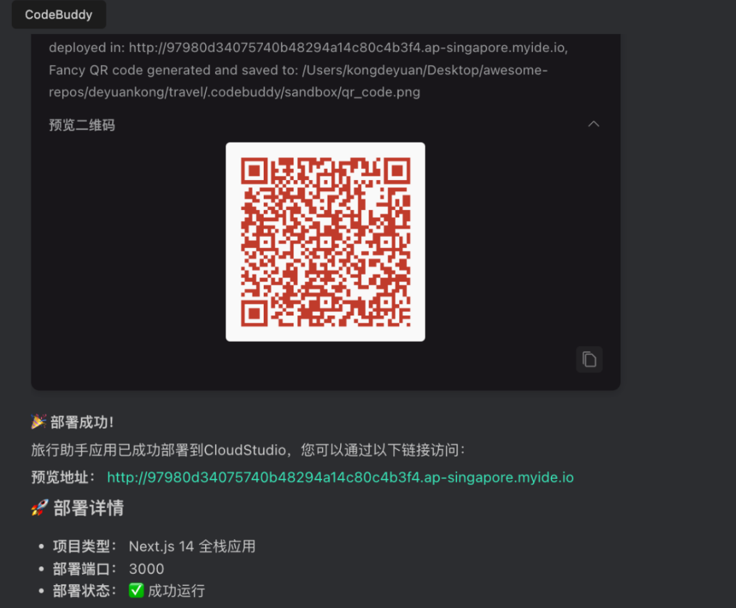 部署成功后,将会生成一个可公开访问的链接和二维码。可以分享给团队,方便快速验证反馈。
