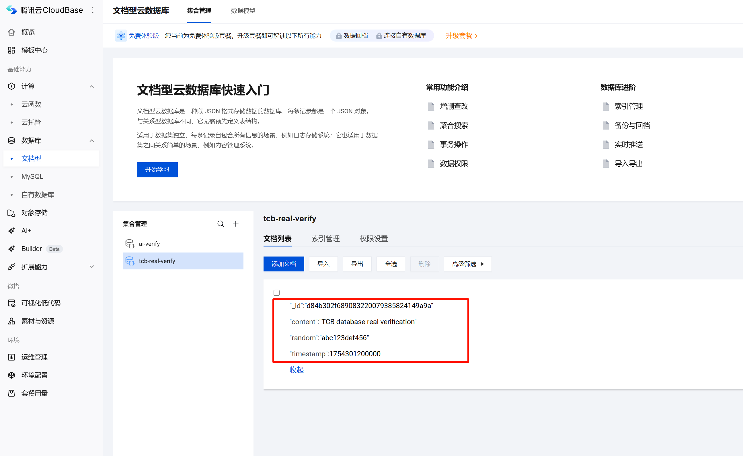 4. 登录腾讯云 CloudBase进行查看,可以看到,在云数据库中文档已经创建成功。