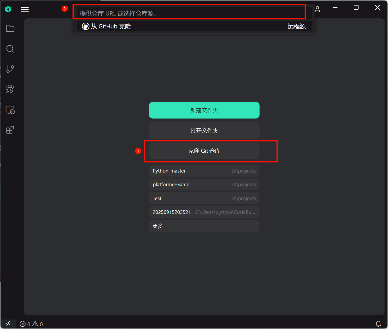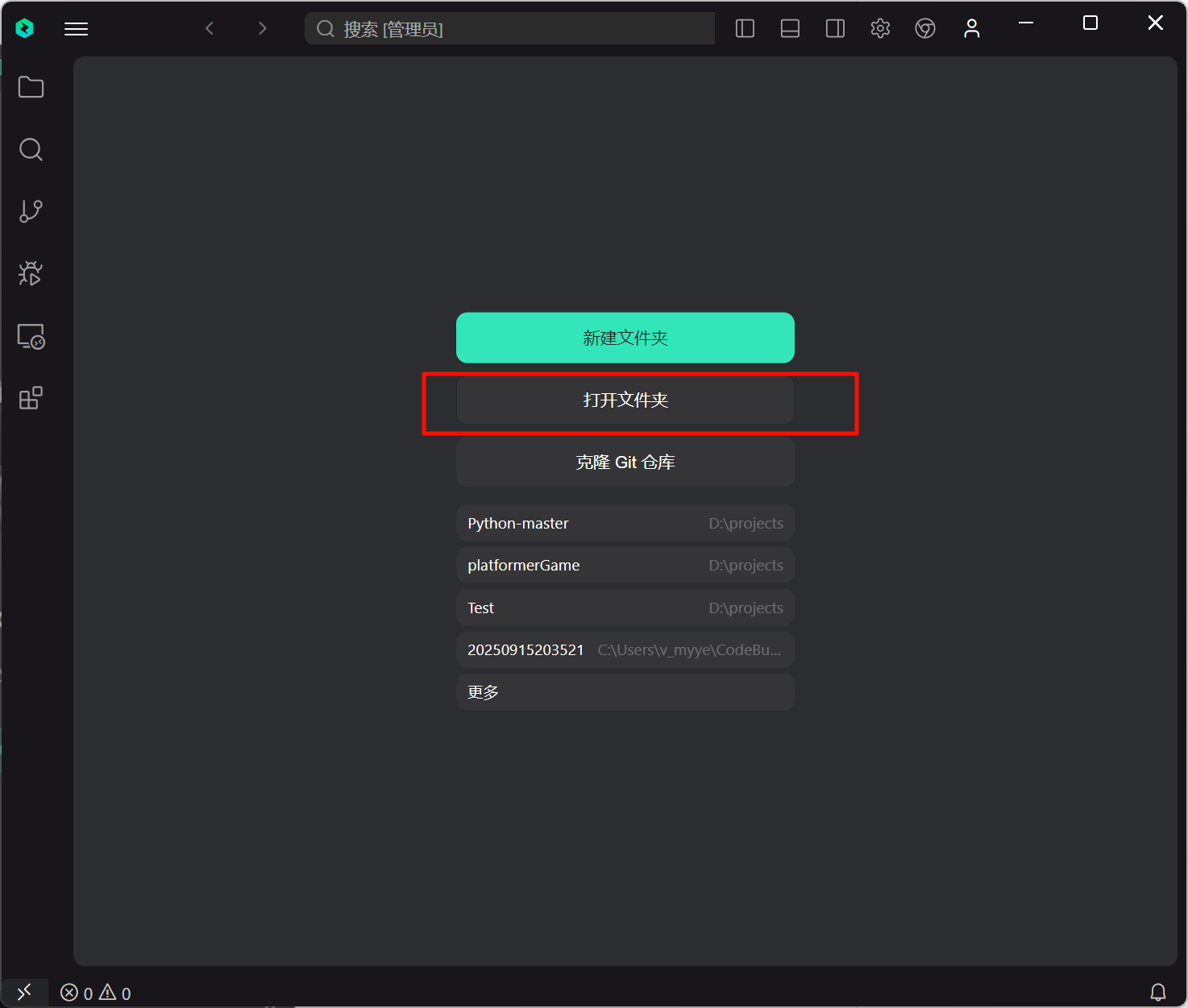 单击新建文件夹或者单击打开文件夹打开已存在的项目文件夹,或克隆远程 Git 仓库项目。