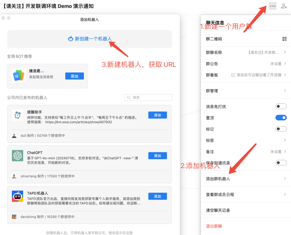 获取企业微信群机器人 Webhook URL 地址,路径:新建企业微信用户群 -> 添加群机器人 -> 获取 WebHook URL 地址。