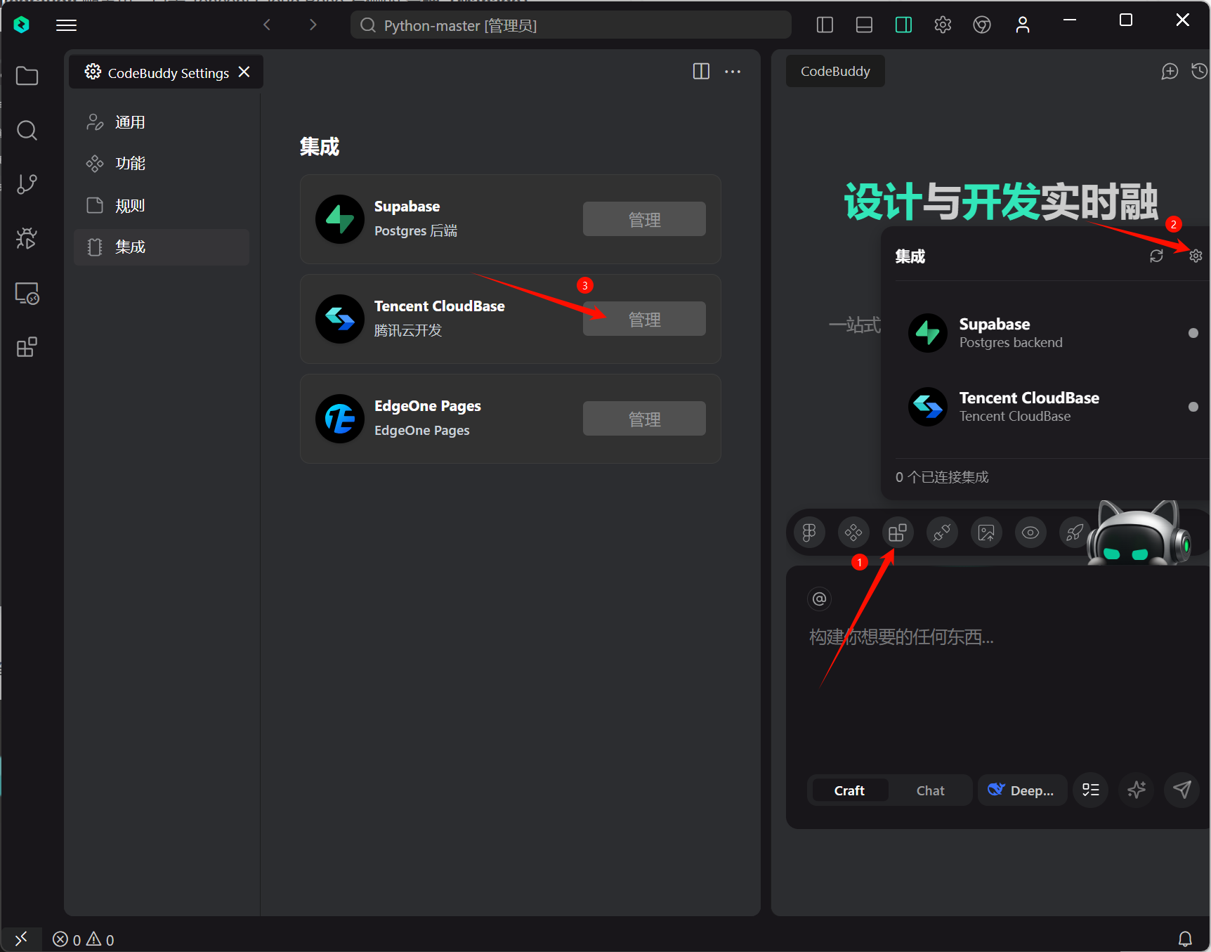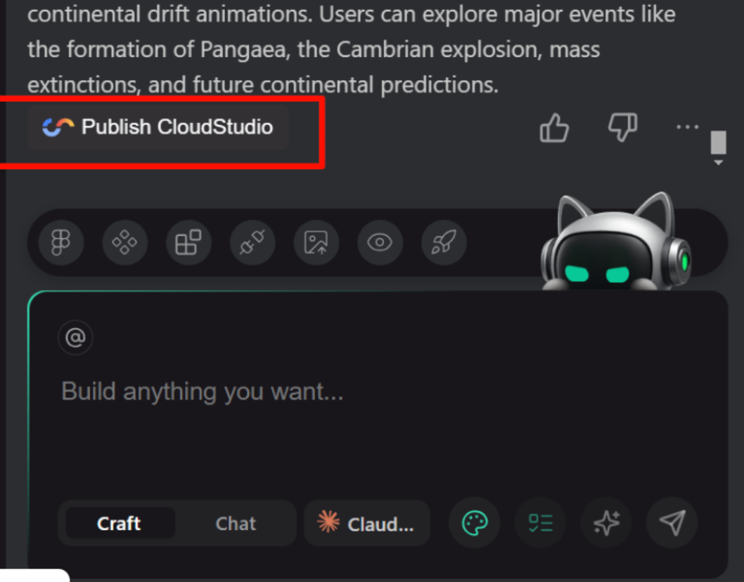 CodeBuddy IDE 支持将您的项目通过 Publish CloudStudio 一键部署至腾讯云的沙箱环境中,并生成可公开访问的链接,方便团队快速验证反馈。在 Craft 模式下,可通过下面两种方式进行一键部署。