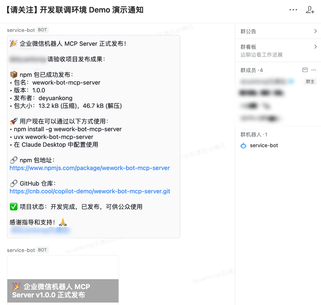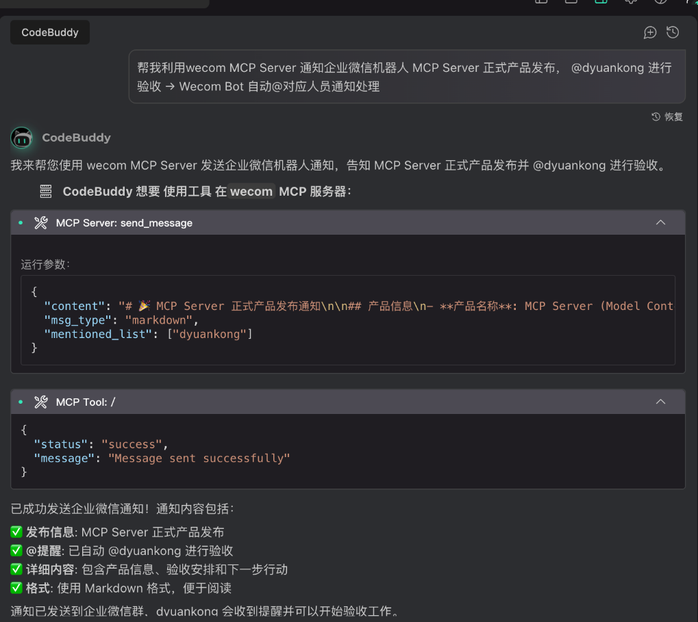 在 Craft 模式下描述你的需求,Agent 将根据你的任务需求进行分析,然后调用 MCP Server 工具来完成任务,例如:利用企业微信机器人 MCP 通知企业微信机器人 MCP Server 正式产品发布, @dyuankong 进行验收 -> Wecom Bot 自动 @ 对应人员通知处理。