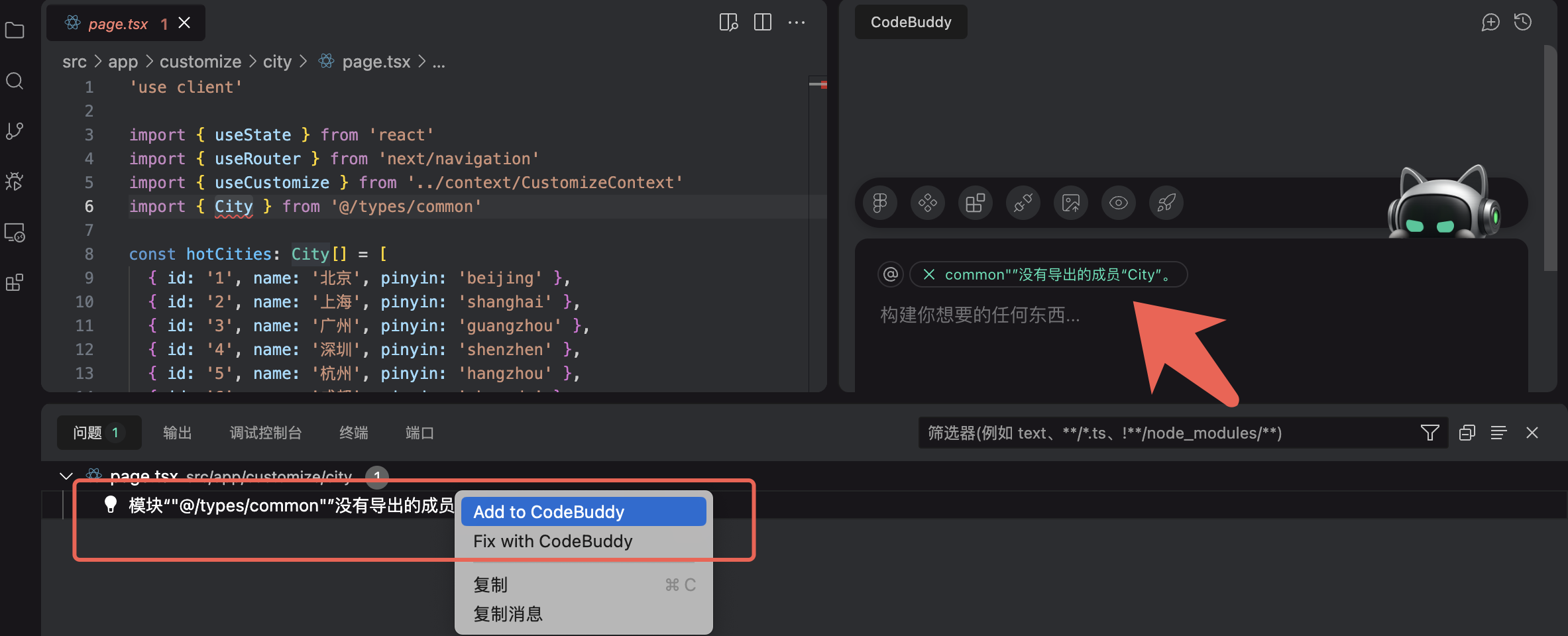 在底部面板中,可以将问题或终端报错添加给 CodeBuddy。