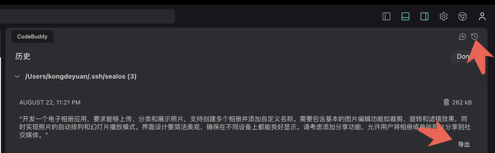 在与 Agent 交互中,存在很多历史对话,在 CodeBuddy IDE 的对话面板右上方,单击 History 按钮,即可查看历史对话列表。支持删除和导出备份至本地。你也可以切换至指定历史对话,继续完成任务。