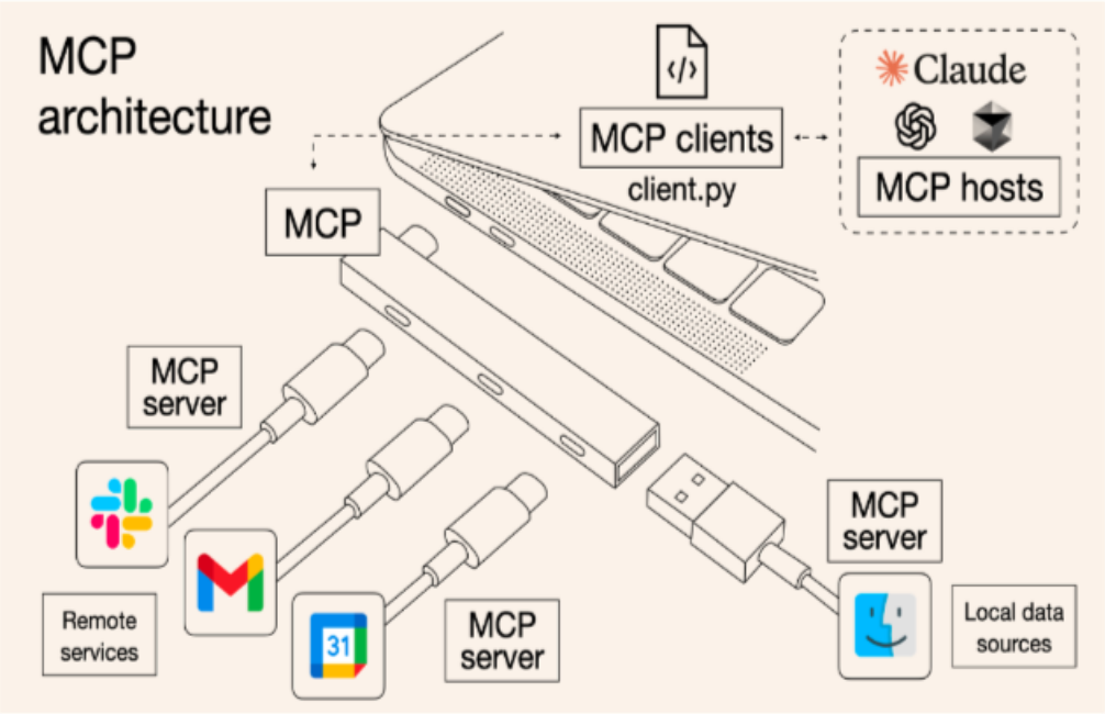 MCP (Model Context Protocol,模型上下文协议) ,旨在解决大模型语言(LLM)与外部数据源及工具之间无缝集成的需求,如同电脑上的 USB 接口或在手机上安装应用程序,是一种给你的 AI 访问额外工具和信息的方式。它通过标准化 AI 系统与数据源的交互方式,帮助模型获取更丰富的上下文信息,从而生成更准确、更相关的响应。其主要的功能如下: