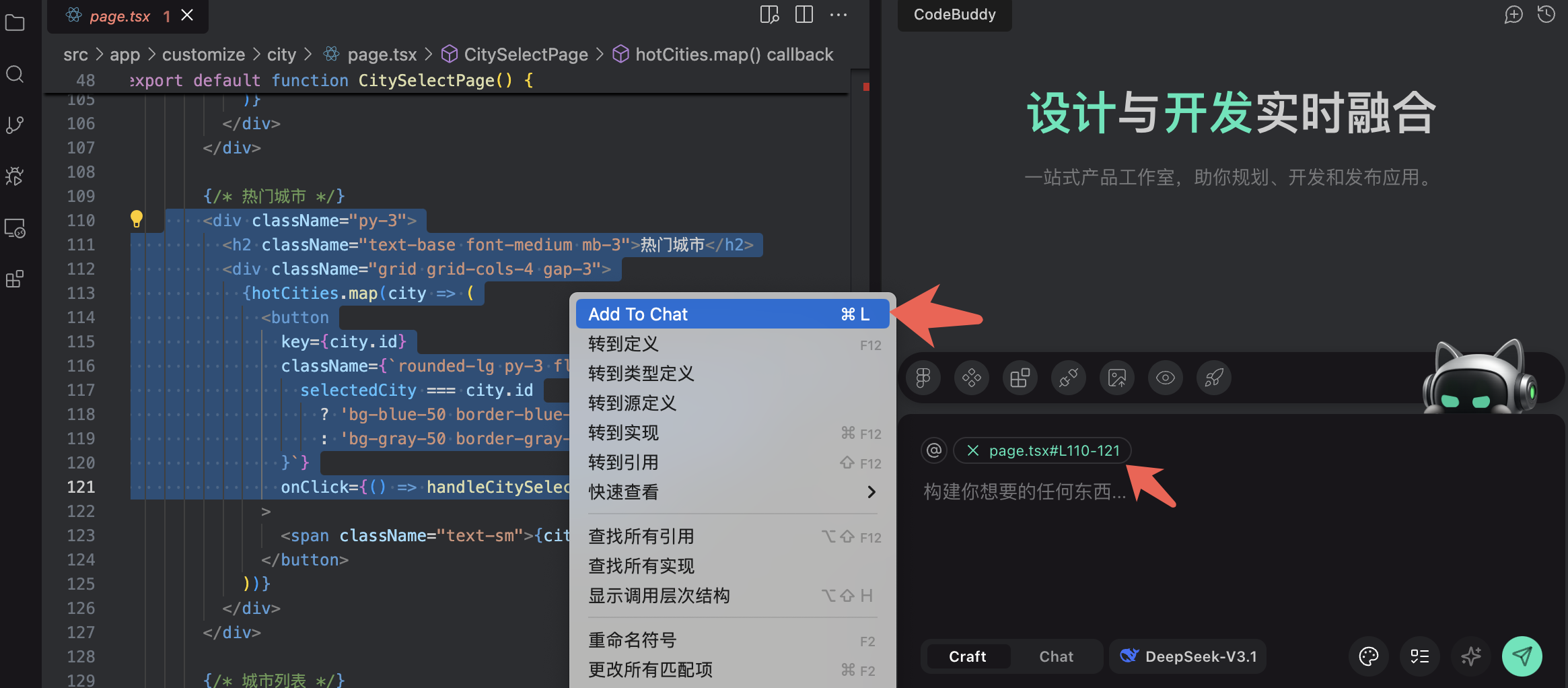 圈选代码后鼠标右键,在菜单选项中选择 Add To Chat。