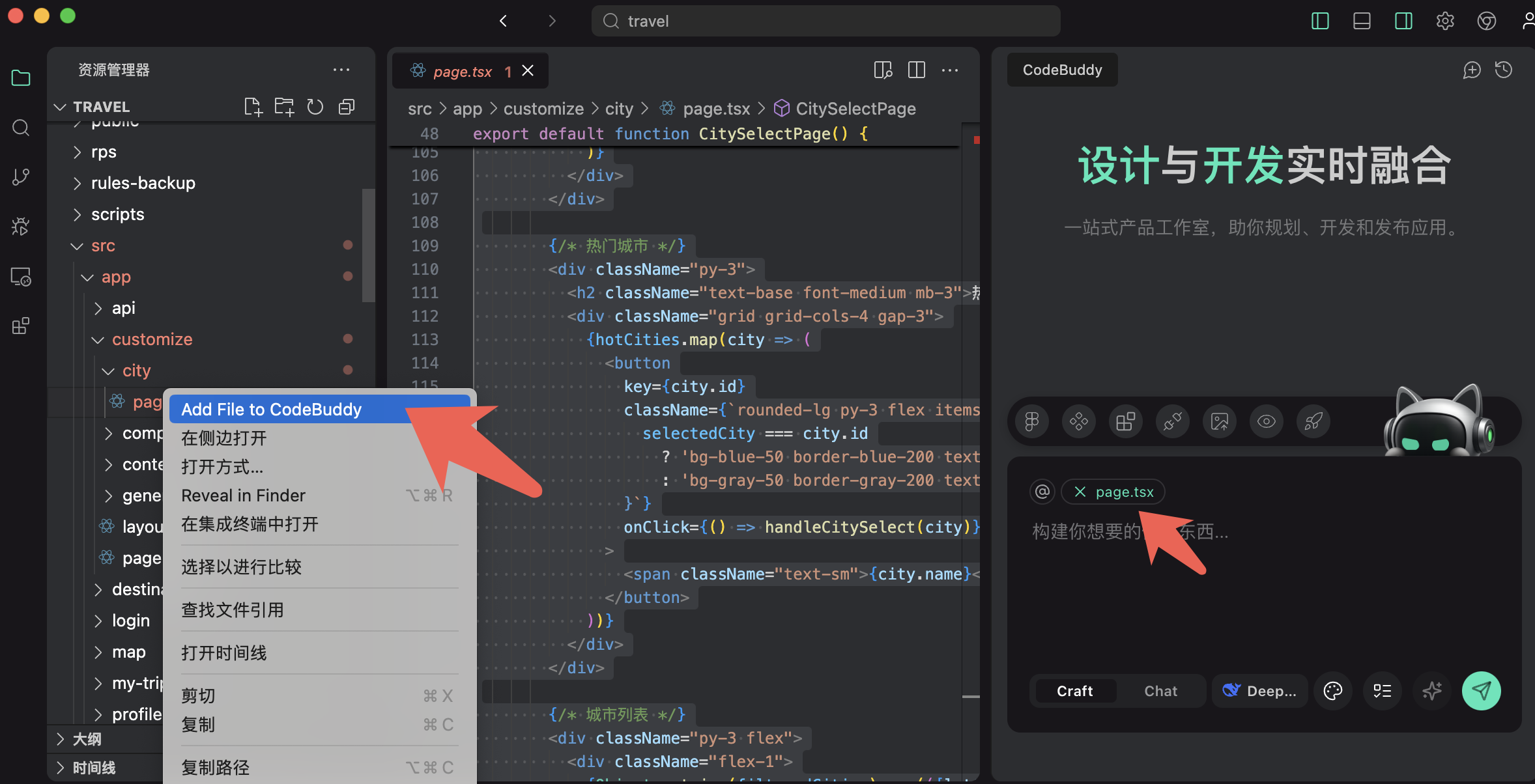 在文件树中,鼠标右键单击文件或目录,在菜单中选择 Add File CodeBuddy,即可将文件或目录添加到对话上下文中。