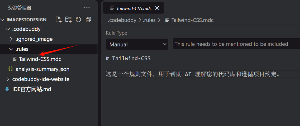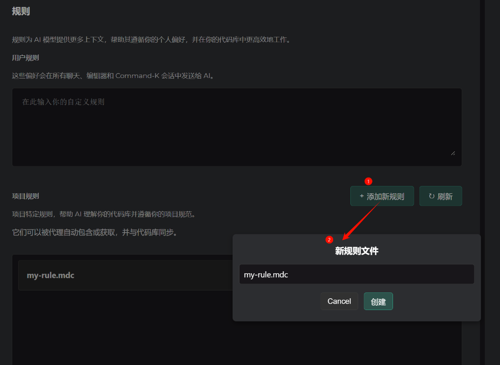 2. 规则名称填写完成后,单击创建按钮,随后便在当前项目根目录的 .codebuddy 目录下自动创建 .rules 目录,并在该目录下自动创建新 mdc 规则文件。
