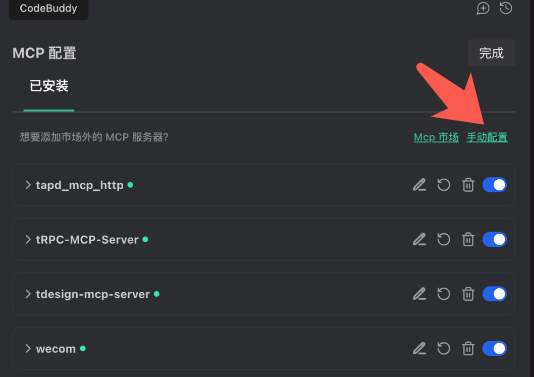 4. 如果安装成功后 MCP Server 将显示绿色状态,否则显示红色状态,例如:
