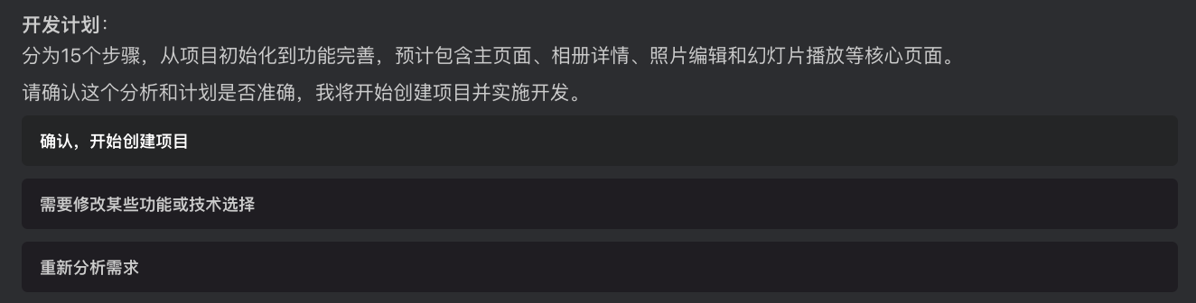 支持 Plan Mode。开启 Plan Mode 后,Agent 将根据项目需求进行任务拆解,制定开发计划并澄清需求,执行计划生成代码。