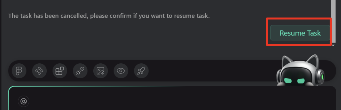 恢复到指定检查点后,该检查点对应进行的任务也会被取消,恢复到该检查点的状态。此时,如果您希望恢复该检查点的任务,可以选择(恢复任务)Resume Task 按钮,单击该按钮后,就会继续该检查点的任务。