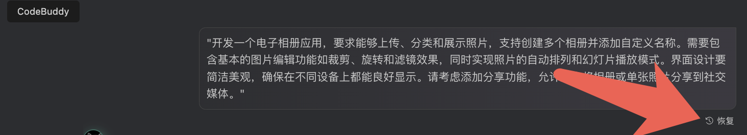 在 Craft 模式下,Agent 进行编码的过程中,每次对话发生文件变更后,Agent 会对这轮对话的文件变更自动创建一轮检查点,即 Checkpoint,并自动做一轮版本化管理(同时建议采用 Git 及时提交代码),实现版本回溯与状态恢复(即,Restore to this checkpoint)。当你在编码过程中存在误操作或实验性代码生成失败时,单击恢复,则可以进行回退版本、重新编辑。