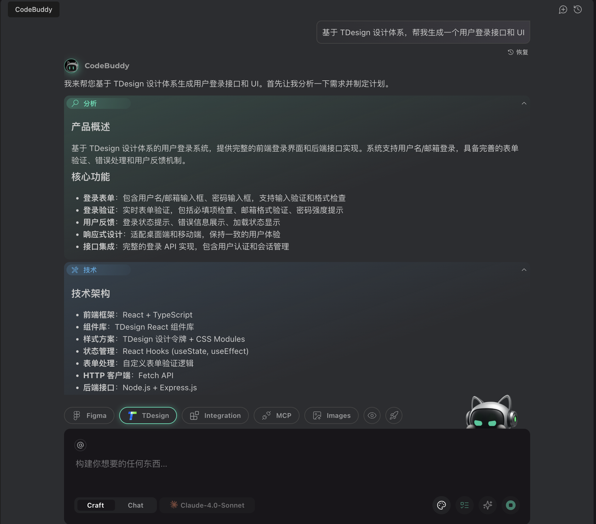 CodeBuddy IDE 设计组件 Component 是设计阶段的核心功能,支持你通过选择标准化组件库规范,直接生成符合企业级设计系统的可维护前端代码,目前提供以下三种组件供使用: